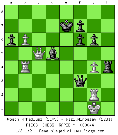Last move : 1/2-1/2 2011 November 7 4:51:31 [Event "FICGS__CHESS__RAPID_M__000044"] [Site "FICGS"] [Date "2011.06.25"] [Round "1"] [White "Wosch,Arkadiusz"] [Black "Gazi,Miroslav"] [Result "1/2-1/2"] [WhiteElo "2109"] [BlackElo "2281"] 1.d4 Nf6 2.c4 e6 3.Nf3 d5 4.Nc3 Bb4 5.Bg5 dxc4 6.e4 c5 7.Bxc4 cxd4 8.Nxd4 Bxc3+ 9.bxc3 Qa5 10.Bb5+ Nbd7 11.Bxf6 Qxc3+ 12.Kf1 gxf6 13.h4 Qb4 14.Rh3 a6 15.Be2 Ne5 16.Rb1 Qd6 17.Rb2 b5 18.Rd2 Qb6 19.Rg3 Bb7 20.f4 Ng6 21.f5 e5 22.fxg6 hxg6 23.Nf3 Bxe4 24.Rg4 Bf5 25.Rb4 Rc8 26.g4 Be6 27.a4 Qe3 28.axb5 e4 29.b6 exf3 30.Bxf3 Rc1 31.Qxc1 Qxf3+ 32.Kg1 Rxh4 33.Rg2 Bd5 34.Qc8+ Ke7 35.Qc5+ Ke6 36.Qc8+ Ke7 37.Qc5+ Ke6 38.Qc8+ Ke7 39.Qc5+ 1/2-1/2 Queen's pawn game This chess game ended in a draw. Follow this game move after move (download)If a ruler does not understand Chess, how can he rule over a kingdom ? (King Khusros II) Wer mein Gambit spielt, muß bereit sein, alle Brücken hinter sich abzubrechen. Es verändert den ganzen Menschen. Es wirkt wie ein Zauberstab und fördert verkümmerte, gute Charakter- eigenschaften wieder zu Tage. (Emil Joseph Diemer) A la fecha, Fischer esta simplemente un nivel arriba de todos los mejores jugadores de Ajedrez del mundo. (John Jacobs) Demandez au pauvre Cg1 ce qu'il en pense. Eduard Gufeld à propos de la variante Saemisch de l'Est-Indienne. Live, lose, and learn, by observing your opponent how to win. (Amber Steenbock)