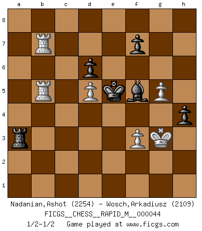 Last move : 1/2-1/2 2011 October 18 11:6:22 [Event "FICGS__CHESS__RAPID_M__000044"] [Site "FICGS"] [Date "2011.06.25"] [Round "1"] [White "Nadanian,Ashot"] [Black "Wosch,Arkadiusz"] [Result "1/2-1/2"] [WhiteElo "2254"] [BlackElo "2109"] 1.Nf3 Nf6 2.d4 g6 3.c4 Bg7 4.Nc3 O-O 5.e4 d6 6.h3 e5 7.d5 a5 8.Bd3 Na6 9.O-O Nh5 10.Bg5 Bf6 11.Be3 Nf4 12.Bc2 Nb4 13.Bb1 Bg7 14.a3 Na6 15.Bc2 Qe7 16.Rb1 Bd7 17.b4 Rfd8 18.Ne2 axb4 19.axb4 b5 20.Nxf4 exf4 21.Bd4 bxc4 22.Bxg7 Kxg7 23.Qd4+ Kg8 24.Qxc4 Rdb8 25.Qc3 Rb6 26.Bd3 Rab8 27.Bxa6 Rxa6 28.Rfe1 c6 29.Nd4 cxd5 30.b5 Rab6 31.exd5 Qf6 32.h4 h5 33.Rb4 R6b7 34.Qb3 Ra8 35.Nc6 Kg7 36.Qd3 Ra2 37.b6 Bg4 38.Qd4 Qxd4 39.Nxd4 Ra5 40.Nc6 Ra6 41.Reb1 f3 42.R1b3 fxg2 43.Kxg2 Kf6 44.Nd8 Rb8 45.b7 Rxd8 46.b8Q Rxb8 47.Rxb8 Bf5 48.f3 Ke5 49.R3b5 Ra2+ 50.Kg3 Ra3 51.R8b7 g5 52.hxg5 h4+ 1/2-1/2 Reti Opening Kingside Castling by player Black (move 4) Kingside Castling by player White (move 9) Promotion Queen by player White (move 46) This chess game ended in a draw. Follow this game move after move (download)An attack on the wing should be met by play in the center. (Nimzovitch) Es ist nicht das erste mal, dass sich die FIDE dem Arabischen Geld gebeugt hat (über die FIDE WM 2004 in Lybien). (Larry Evans) El Ajedrez es un terrible juego. Si no controlas el centro, tu oponente tiene una posición mas holgada. Si tienes control del centro, ¡entonces realmente tu tienes algo de que preocuparte!. (Siegbert Tarrasch) RxDa4 pat (...) There is far too much law for those who can afford it and far too little for those who cannot. (Derek Bok)
