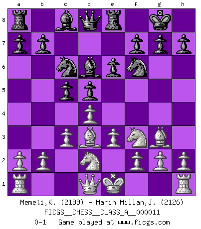 Last move : 0-1 2007 March 6 6:43:0 [Event "FICGS__CHESS__CLASS_A__000011"] [Site "FICGS"] [Date "2006.12.25"] [Round "1"] [White "Memeti,Kastriot"] [Black "Marin Millan,Jose Antonio"] [Result "0-1"] [WhiteElo "2189"] [BlackElo "2126"] 1.d4 d5 2.Bf4 e6 3.e3 Nf6 4.Nd2 c5 5.c3 Bd6 6.Bg3 Nc6 7.Ngf3 O-O 8.Bd3 Re8 0-1 This chess game has been lost on time (started : 2006.12.25 14:48:43) Queen's pawn, Mason variation Kingside Castling by player Black (move 7) Player Black won this chess game. Follow this game move after move (download)It is always better to sacrifice your opponent's men. (Savielly Tartakower) Ich moechte nie einem Club beitreten, der Leute wie mich als Mitglieder aufnimmt. (Woody Allen) Cuando veas una buena jugada, trata de encontrar otra mejor. (Emanuel Lasker) Vous savez, camarade Pachman, je n'éprouve pas de plaisir à être ministre, je jouerais plutôt aux échecs comme vous, ou alors ferais une révolution au Venezuela. (Che Guevara à Ludek Pachman, 'Checkmate in Prague', 1975) God, you are such an idiot. - Actually, I thought I was more of a jerk. (Gregory House to Stacy Warner, House M.D.)