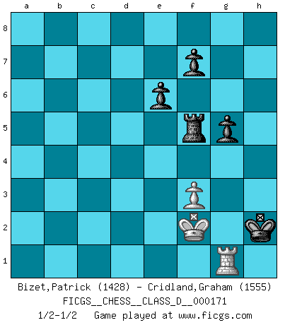 Last move : 1/2-1/2 2012 February 25 20:59:21 [Event "FICGS__CHESS__CLASS_D__000171"] [Site "FICGS"] [Date "2011.06.25"] [Round "1"] [White "Bizet,Patrick"] [Black "Cridland,Graham"] [Result "1/2-1/2"] [WhiteElo "1428"] [BlackElo "1555"] 1.e4 c5 2.Nf3 e6 3.d4 cxd4 4.Nxd4 Nc6 5.Nb5 d6 6.N1c3 a6 7.Na3 b5 8.Naxb5 axb5 9.Bxb5 Bd7 10.a4 Nf6 11.O-O Be7 12.Be3 O-O 13.Qe2 Qc7 14.Rfb1 Rfc8 15.f3 Ne5 16.g4 h6 17.Kf2 Nc4 18.Bc1 d5 19.exd5 Qxh2+ 20.Ke1 Qxe2+ 21.Kxe2 Bxb5 22.Nxb5 Nxd5 23.b3 Ne5 24.c4 Nb4 25.Bd2 Na6 26.Rc1 Nc5 27.Rcb1 Kh7 28.Nc3 Bf6 29.b4 Ncd7 30.c5 Nc4 31.Ra2 Kg8 32.Ne4 Nxd2 33.Nxf6+ Nxf6 34.Kxd2 Kf8 35.Kc3 Nd5+ 36.Kc4 Nb6+ 37.Kb3 Nd7 38.a5 Ke7 39.a6 Nxc5+ 40.bxc5 Rab8+ 41.Kc2 Rxc5+ 42.Kd3 Rxb1 43.a7 Rc8 44.a8Q Rxa8 45.Rxa8 Re1 46.Kd2 Re5 47.Kd3 Kf6 48.Kd4 h5 49.gxh5 Rxh5 50.Ra7 Rh4+ 51.Ke3 g5 52.Rb7 Rh3 53.Ke4 Rh4+ 54.Ke3 Rf4 55.Ra7 Kg6 56.Re7 Kh5 57.Ra7 Kh4 58.Ra1 Rf5 59.Rh1+ Kg3 60.Rg1+ Kh3 61.Kf2 Kh2 62.Rg2+ Kh3 63.Rg1 Kh2 1/2-1/2 Sicilian, Szen (`anti-Taimanov') variation Kingside Castling by player White (move 11) Kingside Castling by player Black (move 12) Promotion Queen by player White (move 44) 10 pieces endgame at move 45 : White KRPP , Black KRPPPP WHITE : King + 1 Rook 2 Pawns BLACK : King + 1 Rook 4 Pawns 9 pieces endgame at move 49 : White KRPP , Black KRPPP WHITE : King + 1 Rook 2 Pawns BLACK : King + 1 Rook 3 Pawns 8 pieces endgame at move 49 : White KRP , Black KRPPP WHITE : King + 1 Rook 1 Pawn BLACK : King + 1 Rook 3 Pawns This chess game ended in a draw. Follow this game move after move (download)The boy (then a 12 year old boy named Anatoly Karpov) doesn't have a clue about Chess, and there's no future at all for him in this profession. (Mikhail Botvinnik) Im Internet Chess Club betrug mein Rating vorübergehend 3350 ELO-Punkte. (Sergej Karjakin) Alguna parte de un error es siempre correcto. (Savielly Tartakover) Les Echecs ont trois composantes : le temps, l'espace et le matériel en dernier. (Mikhail Tal) Luck is what you have left over after you give 100 percent. (Langston Coleman)