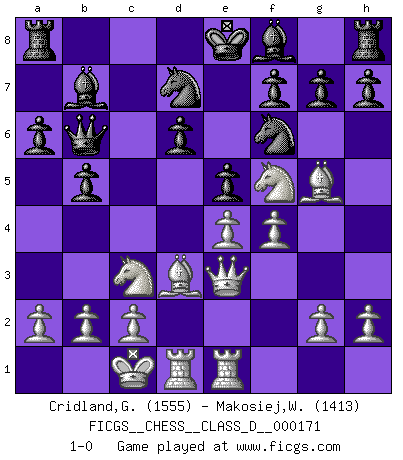 Last move : 1-0 2011 September 1 10:12:42 [Event "FICGS__CHESS__CLASS_D__000171"] [Site "FICGS"] [Date "2011.06.25"] [Round "1"] [White "Cridland,Graham"] [Black "Makosiej,Wladyslaw"] [Result "1-0"] [WhiteElo "1555"] [BlackElo "1413"] 1.e4 c5 2.Nf3 d6 3.d4 cxd4 4.Nxd4 Nf6 5.Nc3 a6 6.Bg5 e6 7.f4 Nbd7 8.Qf3 Qc7 9.O-O-O b5 10.Bd3 Bb7 11.Rhe1 Qb6 12.Qe3 e5 13.Nf5 1-0 Sicilian : Najdorf, 7.f4 Queenside Castling by player White (move 9) Player White won this chess game. Follow this game move after move (download)The hallmark of the artist is simplicity. (Larry Evans) Ich verlor meine Bürgerrechte, mein Gehalt wurde mir nicht mehr bezahlt und ich wurde zensiert und durfte nicht mehr ins Ausland reisen. [nach dem Match Fischer-Taimanov 6:0] (Mark Taimanov) Realmente no sabemos como el juego fue inventado, aunque hay sospechas. Tan pronto como descubramos a los culpables, se los haremos saber. (Bruce Pandolfini) La vie est comme un jeu d'échecs : nous esquissons un plan, mais celui-ci est tributaire de ce que daignent faire l'adversaire aux échecs et le destin dans la vie. (Arthur Schopenhauer) Control your own destiny or someone else will. (Jack Welch)