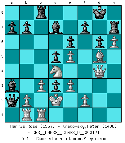 Last move : 0-1 2011 July 28 0:8:7 [Event "FICGS__CHESS__CLASS_D__000171"] [Site "FICGS"] [Date "2011.06.25"] [Round "1"] [White "Harris,Ross"] [Black "Krakovsky,Peter"] [Result "0-1"] [WhiteElo "1557"] [BlackElo "1496"] 1.d4 d5 2.Nf3 Nf6 3.Bf4 e6 4.e3 c5 5.c3 Nc6 6.Bd3 Be7 7.Ne5 O-O 8.Nd2 c4 9.Bc2 Nxe5 10.dxe5 Nd7 11.Qh5 g6 12.Qg4 Qb6 13.Rb1 Nc5 14.h4 h5 15.Qe2 Bd7 16.g4 Nd3+ 17.Bxd3 cxd3 18.Qd1 hxg4 19.Qxg4 Kg7 20.h5 Rh8 21.h6+ Kg8 22.Nf3 Qa6 23.a3 Qc4 24.Nd4 Rh7 25.Kd2 Rc8 26.Bg5 Bxa3 27.Rhc1 Qa2 0-1 Queen's Bishop game Kingside Castling by player Black (move 7) Player Black won this chess game. Follow this game move after move (download)Before the endgame, the Gods have placed the middle game. (Siegbert Tarrasch) Die Jungen erwarten, dass Opa einfach umfällt. Dann aber kann Opa fünf Stunden lang Schach spielen und die jungen Gegner an die Wand drücken. (Viktor Kortschnoi) En manos de Fischer's, una diminuta ventaja teórica es tan buena como tener una Reina de ventaja. (Isaac Kashdan) Le jeu d'échecs est comme rejeté hors du temps. (Antoine de Saint-Exupéry) Opportunities multiply as they are seized. (Sun Tzu)