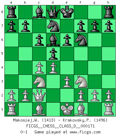 Last move : 0-1 2011 August 15 9:29:55 [Event "FICGS__CHESS__CLASS_D__000171"] [Site "FICGS"] [Date "2011.06.25"] [Round "1"] [White "Makosiej,Wladyslaw"] [Black "Krakovsky,Peter"] [Result "0-1"] [WhiteElo "1413"] [BlackElo "1496"] 1.d4 d5 2.c4 c6 3.Nc3 Nf6 4.Nf3 e6 5.e3 Nbd7 6.Qc2 Bd6 0-1 This chess game has been lost on time (started : 2011.06.25 23:49:17) QGD Slav defense Player Black won this chess game. Follow this game move after move (download)White lost because he failed to remember the right continuation and had to think up the moves himself. (Siegbert Tarrasch) Spiel ein langweiliges Spiel zu Ende und lustige Dinge können passieren. (Hans Ree) ¿Que sería del Ajedrez sin errores graciosos?. (Kurt Richter) Que feriez-vous si vous étiez en train de jouer aux échecs et que la fin du monde arrive ? Je continuerais à jouer. (Saint Borromée) I would love to change the world, but they won't give me the source code. (Unknown)