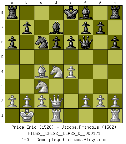Last move : 1-0 2011 August 13 15:2:10 [Event "FICGS__CHESS__CLASS_D__000171"] [Site "FICGS"] [Date "2011.06.25"] [Round "1"] [White "Price,Eric"] [Black "Jacobs,Francois"] [Result "1-0"] [WhiteElo "1528"] [BlackElo "1502"] 1.e4 c5 2.Nf3 d6 3.d4 cxd4 4.Nxd4 Nf6 5.Nc3 a6 6.Bg5 e6 7.Qd2 h6 8.Bxf6 Qxf6 9.O-O-O Bd7 10.Kb1 Nc6 11.Bc4 1-0 Sicilian : Najdorf, 6...e6 Queenside Castling by player White (move 9) Player White won this chess game. Follow this game move after move (download)That's what Chess is all about. One day you give your opponent a lesson, the next day he gives you one. (Bobby Fischer) Taktik ist was man tun muß, wenn etwas zu tun ist. Strategie ist was man tun muß, wenn nichts zu tun ist. (Savielly Grigorievitsch Tartakower) Peones: ellos son el alma de esta partida, solos forman el ataque y la defensa. (Philidor) Un journaliste : 'Vous préférez avoir une dame de plus sur l'échiquier ou au lit ?' Boris Spassky : 'Ca dépend de la position.' Tree pose grows confidence. It roots me to this world. (Terri Guillemets)