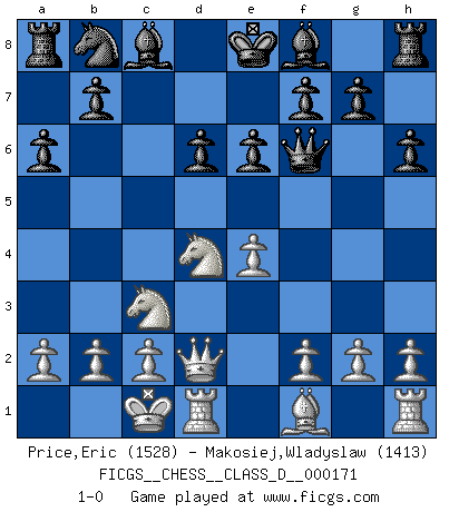 Last move : 1-0 2011 August 28 22:3:52 [Event "FICGS__CHESS__CLASS_D__000171"] [Site "FICGS"] [Date "2011.06.25"] [Round "1"] [White "Price,Eric"] [Black "Makosiej,Wladyslaw"] [Result "1-0"] [WhiteElo "1528"] [BlackElo "1413"] 1.e4 c5 2.Nf3 d6 3.d4 cxd4 4.Nxd4 Nf6 5.Nc3 a6 6.Bg5 e6 7.Qd2 h6 8.Bxf6 Qxf6 9.O-O-O 1-0 This chess game has been lost on time (started : 2011.06.25 23:49:17) Sicilian : Najdorf, 6...e6 Queenside Castling by player White (move 9) Player White won this chess game. Follow this game move after move (download)The tactician knows what to do when there is something to do; whereas the strategian knows what to do when there is nothing to do. (Gerald Abrahams) Mit sehr nachdenklichem Gesicht schreitet Bobby durch den Turniersaal. Was ist passiert?, fragt Lombardy. Ich stehe schlecht, antwortet Fischer. Lombardy: Dann biete doch einfach Remis an. Fischer: So schlecht stehe ich nun auch wieder nicht! (Robert James Fischer) Tu sabes, camarada Pachman, no disfruto el ser un Ministro, preferería jugar al Ajedrez como tu. (Che Guevara) Lorsque vous vous retrouvez devant une position atroce, ne tendez pas un ultime piège dérisoire avec l'intention d'abandonner si l'adversaire le déjoue ! Faites-vous plutôt un devoir de résister comme si votre vie en dépendait. Jouez le coup qui vous déplairait au centuple si vous étiez dans la peau de votre tortionnaire ! For a mechanic, you seem to do an excessive amount of thinking. (C-3PO in Star Wars ep.2)