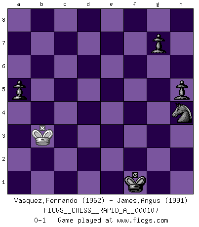 Last move : 0-1 2011 November 26 23:56:13 [Event "FICGS__CHESS__RAPID_A__000107"] [Site "FICGS"] [Date "2011.06.28"] [Round "1"] [White "Vasquez,Fernando"] [Black "James,Angus"] [Result "0-1"] [WhiteElo "1962"] [BlackElo "1991"] 1.e4 c5 2.d4 cxd4 3.c3 dxc3 4.Nxc3 Nc6 5.Nf3 e6 6.Bf4 d6 7.Bc4 Be7 8.Nb5 e5 9.Bg5 Be6 10.Bxe6 fxe6 11.Bxe7 Qa5+ 12.Nd2 Kxe7 13.a4 Nf6 14.b4 Qd8 15.Rc1 a6 16.Na3 Nd4 17.O-O Rc8 18.Re1 Rxc1 19.Qxc1 Qc8 20.Qb2 Qc6 21.b5 Qc7 22.Kh1 Rc8 23.bxa6 bxa6 24.Nac4 Rb8 25.Qc3 Qc5 26.a5 Nc6 27.Qg3 Kf8 28.f4 exf4 29.Qxf4 Rd8 30.h3 Kg8 31.Kh2 Ne5 32.Nxe5 dxe5 33.Nb3 Qc3 34.Re3 exf4 35.Rxc3 e5 36.Nc5 Rc8 37.Kg1 Kf7 38.Kf1 Ke7 39.Ke2 Nd7 40.Na4 Rxc3 41.Nxc3 Kd6 42.Nd5 Kc6 43.Kd3 Kb5 44.Nc7+ Kxa5 45.Kc4 Kb6 46.Nd5+ Kb7 47.Nb4 a5 48.Nd3 Kc6 49.Ne1 Nb6+ 50.Kc3 Kb5 51.Nd3 Nd7 52.h4 h5 53.Ne1 Nc5 54.Nf3 Nxe4+ 55.Kc2 Ng3 56.Nxe5 Nf5 57.Nf3 Kc4 58.Kb2 Kd3 59.Ne5+ Ke4 60.Nf3 Ne3 61.Kc3 Nxg2 62.Nd2+ Ke3 63.Kc2 Nxh4 64.Nc4+ Ke2 65.Nd6 f3 66.Ne4 f2 67.Kb3 f1Q 68.Ng3+ Ke1 69.Nxf1 Kxf1 0-1 Sicilian : Smith-Morra gambit Kingside Castling by player White (move 17) 10 pieces endgame at move 56 : White KNPP , Black KNPPPP WHITE : King + 1 Knight 2 Pawns BLACK : King + 1 Knight 4 Pawns 9 pieces endgame at move 61 : White KNP , Black KNPPPP WHITE : King + 1 Knight 1 Pawn BLACK : King + 1 Knight 4 Pawns 8 pieces endgame at move 63 : White KN , Black KNPPPP WHITE : King + 1 Knight BLACK : King + 1 Knight 4 Pawns Promotion Queen by player Black (move 67) 7 pieces endgame at move 69 : White KN , Black KNPPP WHITE : King + 1 Knight BLACK : King + 1 Knight 3 Pawns 6 pieces endgame at move 69 : White K , Black KNPPP WHITE : King + BLACK : King + 1 Knight 3 Pawns Player Black won this chess game. Follow this game move after move (download)I know people who have all the will in the world, but still can't play good Chess. (Bobby Fischer) Ich bin der einzige Schachspieler, der sich während der Vorbereitungen zum Turnier verletzt hat. (Woody Allen) La maestría del Ajedrez consiste esencialmente en analizar posiciónes de Ajedrez con precisión. (Mikhail Botvinnik) Le succès, c'est être capable d'aller d'échec en échec sans perdre son enthousiasme. (Winston Churchill) A woman without a man is like a fish without a bicycle. (Gloria Steinem)
