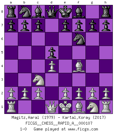Last move : 1-0 2011 September 9 10:20:2 [Event "FICGS__CHESS__RAPID_A__000107"] [Site "FICGS"] [Date "2011.06.28"] [Round "1"] [White "Magitz,Aaral"] [Black "Kartal,Koray"] [Result "1-0"] [WhiteElo "1979"] [BlackElo "2017"] 1.Nc3 d5 2.d4 Nf6 3.Bf4 1-0 This chess game has been lost on time (started : 2011.06.28 7:54:5) Dunst (Sleipner, Heinrichsen) Opening Player White won this chess game. Follow this game move after move (download)Without error there can be no brilliancy. (Emanuel Lasker) Der Verteidiger gebe der Gewalt nach, aber nur der Gewalt. Er schaffe sich nicht freiwillig, etwa aus Blindheit oder aus Schrecken, irgendwelche Schwächen. Er lasse sich nicht bluffen. (Emanuel Lasker) El juego del Ajedrez no es solamente una diversión quieta; algunas cualidades muy valuables de la mente se pueden adquirir y cultivar con el, como convertirlos en habitos disponibles para toda ocasión; ya que la vida es algo así como el Ajedrez. (Benjamin Franklin) Horreur, mais aussi harmonie suprême : qu'y avait-il en effet au monde en dehors des échecs ? Le brouillard, l'inconnu, le non-être... (Vladimir Nabokov) Perception is reality. (Immanuel Kant)