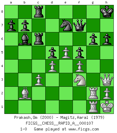 Last move : 1-0 2011 September 22 22:43:22 [Event "FICGS__CHESS__RAPID_A__000107"] [Site "FICGS"] [Date "2011.06.28"] [Round "1"] [White "Prakash,Om"] [Black "Magitz,Aaral"] [Result "1-0"] [WhiteElo "2000"] [BlackElo "1979"] 1.e4 e6 2.Nf3 d5 3.e5 c5 4.b4 cxb4 5.d4 Nc6 6.a3 Bd7 7.axb4 Bxb4+ 8.c3 Ba5 9.Bd3 Nge7 10.Ba3 O-O 11.O-O h6 12.Bc2 f5 13.Qd3 Bc7 14.Nbd2 Na5 15.Nh4 Rf7 16.g4 Rc8 17.f4 Bb6 18.gxf5 Nxf5 19.Nxf5 exf5 20.Rf2 Be6 21.Rg2 Rfc7 22.Bb2 Nc6 23.Qg3 Qf8 24.Bd1 Kh8 25.Kh1 Ne7 26.Bh5 Bf7 27.Bxf7 Qxf7 28.Rag1 g6 29.Nf3 Rc6 30.Qh3 1-0 This chess game has been lost on time (started : 2011.06.28 7:54:5) French : Wing gambit Kingside Castling by player Black (move 10) Kingside Castling by player White (move 11) Player White won this chess game. Follow this game move after move (download)Those who say they understand Chess, understand nothing. (Robert Hubner) Herr Iljumschinow ist ein etwas merkwürdiger Geschäftsmann: Er arbeitet zusammen mit Leuten wie Muammar al-Gaddafi; früher ist das Saddam Hussein gewesen. (Joel Lautier) Todo se encuentra en un estado de flujo y esto incluye al mundo del Ajedrez. (Mikhail Botvinnik) On est toujours la mazette de quelqu'un d'autre. (Anonyme) Everything in life is luck. (Donald Trump)