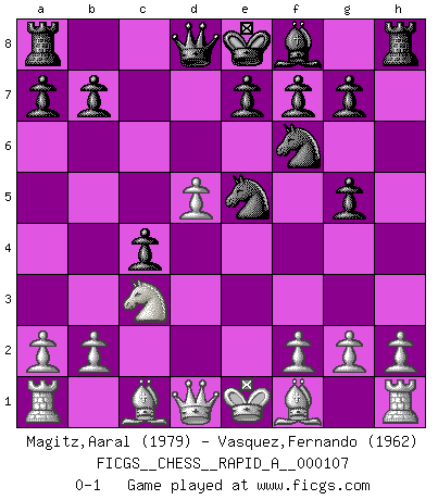Last move : 0-1 2011 September 12 22:20:54 [Event "FICGS__CHESS__RAPID_A__000107"] [Site "FICGS"] [Date "2011.06.28"] [Round "1"] [White "Magitz,Aaral"] [Black "Vasquez,Fernando"] [Result "0-1"] [WhiteElo "1979"] [BlackElo "1962"] 1.Nf3 Nf6 2.d4 d5 3.c4 dxc4 4.e3 Be6 5.Nc3 c6 6.Ng5 Bd5 7.e4 h6 8.exd5 hxg5 9.dxc6 Nxc6 10.d5 Ne5 0-1 This chess game has been lost on time (started : 2011.06.28 7:54:5) Reti Opening Player Black won this chess game. Follow this game move after move (download)Mistrust is the most necessary characteristic of the Chess player. (Siegbert Tarrasch) Schach ist gnadenlos. Du mußt bereit sein zu töten. (Nigel Short) Cada Peón es una Reina en potencia. (James Mason) Tout change constamment, y compris dans le monde des Echecs. (Botvinnik) There is no instance of a country having benefited from prolonged warfare. (Sun Tzu)