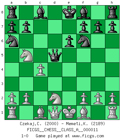 Last move : 1-0 2007 February 20 11:12:30 [Event "FICGS__CHESS__CLASS_A__000011"] [Site "FICGS"] [Date "2006.12.25"] [Round "1"] [White "Czekaj,Christophe"] [Black "Memeti,Kastriot"] [Result "1-0"] [WhiteElo "2000"] [BlackElo "2189"] 1.e4 e6 2.d4 d5 3.Nd2 c5 4.Ngf3 cxd4 5.Nxd4 Nf6 6.exd5 Qxd5 7.Nb5 Na6 8.c4 1-0 This chess game has been lost on time (started : 2006.12.25 14:48:43) French : Tarrasch, Open variation Player White won this chess game. Follow this game move after move (download)After a bad opening, there is hope for the middle game. After a bad middle game, there is hope for the endgame. But once you are in the endgame, the moment of truth has arrived. (Edmar Mednis) Schach wird sich dank seiner hohen kulturellen Tradition immer durchsetzen. In näherer Zukunft womöglich sogar als Gegenreaktion auf die maßlose Reizüberflutung im Freizeit- und Spielbereich. (Garry Kasparov) El Ajedrez se juega con la mente... ¡no con las manos!. (Renaud y Kahn) Mais n'est-ce pas déjà le limiter injurieusement que d'appeler les échecs un jeu? N'est-ce pas aussi une science, un art, ou quelque chose qui, comme le cercueil de Mahomet entre ciel et terre, est suspendu entre l'un et l'autre, et qui réunit un nombre incroyable de contraires ? (Stefan Zweig) But they are useless. They can only give you answers. (Pablo Picasso, about computers)