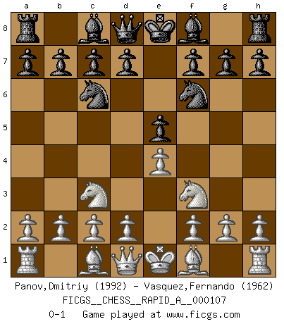 Last move : 0-1 2011 August 2 9:4:3 [Event "FICGS__CHESS__RAPID_A__000107"] [Site "FICGS"] [Date "2011.06.28"] [Round "1"] [White "Panov,Dmitriy"] [Black "Vasquez,Fernando"] [Result "0-1"] [WhiteElo "1992"] [BlackElo "1962"] 1.e4 e5 2.Nf3 Nf6 3.Nc3 Nc6 0-1 This chess game has been lost on time (started : 2011.06.28 7:54:5) Petrov Three knights game Player Black won this chess game. Follow this game move after move (download)Chess is above all, a fight ! (Emanuel Lasker) Ein Kibitz ist einer, der deinem Gegner gute Ratschläge gibt. (Andrew Soltis) Alekhine es un poeta que crea un trabajo de arte de algo que raramente inspiraría a otra persona a mandar una tarjeta postal. (Max Euwe) Le génie consiste à savoir transgresser les règles au moment opportun. (Teichmann) I've lost money so fast in these clubs it's left me reeling. I've read every poker book ever written, but the only way to get better at the game is to go out and play with people who are really good. The problem is, you stand to lose a lot of money doing it. (Matt Damon)