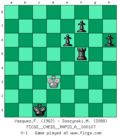 Last move : 0-1 2011 November 7 1:37:13 [Event "FICGS__CHESS__RAPID_A__000107"] [Site "FICGS"] [Date "2011.06.28"] [Round "1"] [White "Vasquez,Fernando"] [Black "Soszynski,Marek"] [Result "0-1"] [WhiteElo "1962"] [BlackElo "2088"] 1.e4 g6 2.d4 Bg7 3.Nf3 d6 4.Nc3 a6 5.Be2 b5 6.O-O Bb7 7.e5 e6 8.a4 b4 9.Na2 Nc6 10.Bd2 a5 11.c3 bxc3 12.Nxc3 Nge7 13.Bg5 dxe5 14.Qb3 exd4 15.Qxb7 dxc3 16.bxc3 O-O 17.Rfd1 Rb8 18.Qa6 Qc8 19.Qc4 Qb7 20.Bf1 h6 21.Bd2 Qb3 22.Qe4 Rfd8 23.Bb5 Qd5 24.Qc2 Qc5 25.Rac1 Nd5 26.h4 Nce7 27.h5 g5 28.Nd4 c6 29.Be2 Nf4 30.Bxf4 gxf4 31.Qe4 Bxd4 32.cxd4 Qf5 33.Qf3 Rb4 34.Qa3 Qf6 35.Rc5 R8xd4 36.Rxa5 Rxd1+ 37.Bxd1 Rb1 38.Ra8+ Kg7 39.Rd8 Qa1 40.Qxa1+ Rxa1 41.Kh2 Nd5 42.Bb3 Ra3 43.Rb8 Nf6 44.Bd1 Ra1 45.Be2 Rxa4 46.Rb2 Nd7 47.g3 fxg3+ 48.fxg3 Kf6 49.Kg1 Ne5 50.Rc2 Kf5 51.Kf2 Ke4 52.Bd1 Ra3 53.Be2 Ra5 54.Kf1 c5 55.Rc1 Ke3 56.Re1 Nd3 57.Bxd3 Kxd3 58.Rd1+ Ke3 59.Re1+ Kd2 60.Re2+ Kd3 61.Re1 c4 62.Rd1+ Ke3 63.Re1+ Kd2 64.Re2+ Kd3 65.Re1 c3 66.Rd1+ Ke3 67.Re1+ Kd2 68.g4 Ra4 69.Re2+ Kd3 70.Re1 c2 71.Kf2 Rf4+ 72.Kg3 Kd2 73.Rg1 Rc4 74.g5 Rc5 75.Ra1 c1Q 76.Rxc1 Rxg5+ 77.Kf4 Kxc1 78.Ke3 Rxh5 79.Kd3 Rf5 0-1 Robatsch (Modern) defense Kingside Castling by player White (move 6) Kingside Castling by player Black (move 16) 10 pieces endgame at move 57 : White KRPP , Black KRPPPP WHITE : King + 1 Rook 2 Pawns BLACK : King + 1 Rook 4 Pawns Promotion Queen by player Black (move 75) 9 pieces endgame at move 76 : White KRPP , Black KRPPP WHITE : King + 1 Rook 2 Pawns BLACK : King + 1 Rook 3 Pawns 8 pieces endgame at move 76 : White KRP , Black KRPPP WHITE : King + 1 Rook 1 Pawn BLACK : King + 1 Rook 3 Pawns 7 pieces endgame at move 77 : White KP , Black KRPPP WHITE : King + 1 Pawn BLACK : King + 1 Rook 3 Pawns 6 pieces endgame at move 78 : White K , Black KRPPP WHITE : King + BLACK : King + 1 Rook 3 Pawns Player Black won this chess game. Follow this game move after move (download)Why must I lose to this idiot ? (Aron Nimzovich) Wenn Capablanka heute auf der Schachbühne erscheinen würde, hätte er ein halbes Jahr gebraucht um sich die Schachtheorie anzueignen. Und dann hätte er alles und jeden besiegt. (Mikhail Moiseyevich Botvinik) No puedes jugar al Ajedrez si eres de corazón noble. (Proverbio Francés) Je ne crois pas en la psychologie, je crois aux bons coups. (Robert Fischer) We need strong personalities and only one world champion to attract sponsors. (Anatoly Karpov)