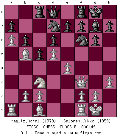 Last move : 0-1 2011 October 7 11:37:40 [Event "FICGS__CHESS__CLASS_B__000149"] [Site "FICGS"] [Date "2011.06.29"] [Round "1"] [White "Magitz,Aaral"] [Black "Salonen,Jukka"] [Result "0-1"] [WhiteElo "1979"] [BlackElo "1859"] 1.e4 c5 2.Nf3 d6 3.Bc4 Nc6 4.d4 Bg4 5.h3 Bxf3 6.Qxf3 Nf6 7.d5 Ne5 8.Bb5+ Ned7 9.O-O g6 10.a4 Bg7 11.a5 O-O 12.Nc3 Rc8 13.a6 b6 0-1 Sicilian Kingside Castling by player White (move 9) Kingside Castling by player Black (move 11) Player Black won this chess game. Follow this game move after move (download)Though most people love to look at the games of the great attacking masters, some of the most successful players in history have been the quiet positional players. They slowly grind you down by taking away your space, tying up your pieces, and leaving you with virtually nothing to do ! (Yasser Seirawan) Ein Buch ist ein Spiegel; wenn ein Affe hineinsieht, so kann kein Apostel heraus gucken. (Georg Christoph Lichtenberg) Cada Peón es una Reina en potencia. (James Mason) Aux échecs, l'amour-propre est satisfait quand on remporte la victoire, mais il n'y a pas de honte à être battu. (Benjamin Franklin) If we don't succeed, we run the risk of failure. (George W. Bush)