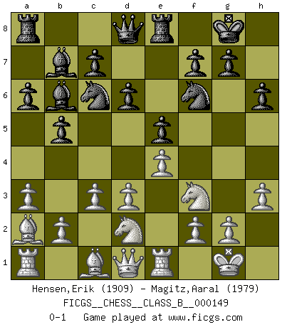 Last move : 0-1 2011 September 21 10:35:25 [Event "FICGS__CHESS__CLASS_B__000149"] [Site "FICGS"] [Date "2011.06.29"] [Round "1"] [White "Hensen,Erik"] [Black "Magitz,Aaral"] [Result "0-1"] [WhiteElo "1909"] [BlackElo "1979"] 1.e4 e5 2.Nf3 Nc6 3.Bb5 a6 4.Ba4 Bd6 5.O-O Nf6 6.Re1 b5 7.Bb3 O-O 8.d3 Bb7 9.c3 h6 10.h3 Re8 11.a3 Bc5 12.Ba2 Bb6 13.Nbd2 d6 0-1 Ruy Lopez Kingside Castling by player White (move 5) Kingside Castling by player Black (move 7) Player Black won this chess game. Follow this game move after move (download)Dazzling combinations are for the many, shifting wood is for the few. (Georg Kieninger) Ich tröste mich mit dem Vergnügen, daß Schachfans, Zuschauer und Leser glücklich sind, wenn ein Großmeister etwas riskiert, statt nur Klötzchen zu schieben. (Mikhail Nekhemyevich Tal) La caracteristica mas importante en la posición del Ajedrez es la actividad de las piezas. Esto es absolutamente fundamental en todas las fases del juego: Apertura, Juego Medio y especialmente Finales. La limitación primordial en la actividad de una pieza, es la estructuración de los Peones. (Michael Stean) Horreur, mais aussi harmonie suprême : qu'y avait-il en effet au monde en dehors des échecs ? Le brouillard, l'inconnu, le non-être... (Vladimir Nabokov) Life is pleasant. Death is peaceful. It's the transition that's troublesome. (Isaac Asimov)