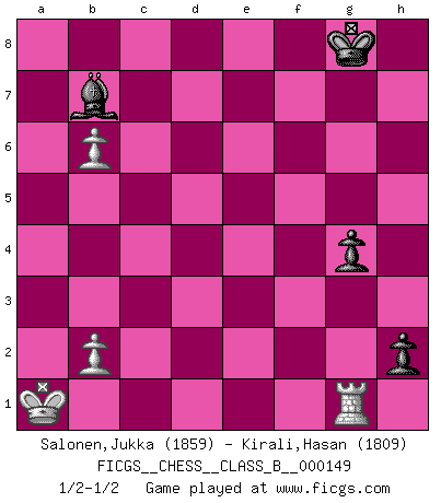 Last move : 1/2-1/2 2012 January 28 9:2:7 [Event "FICGS__CHESS__CLASS_B__000149"] [Site "FICGS"] [Date "2011.06.29"] [Round "1"] [White "Salonen,Jukka"] [Black "Kirali,Hasan"] [Result "1/2-1/2"] [WhiteElo "1859"] [BlackElo "1809"] 1.Nf3 d5 2.d4 Nf6 3.c4 e6 4.Nc3 Be7 5.Qc2 O-O 6.Bg5 Nbd7 7.e3 c5 8.O-O-O dxc4 9.Bxc4 Qa5 10.dxc5 Qxc5 11.Bd3 h6 12.Bh4 b6 13.Bb5 a6 14.Bxd7 Nxd7 15.Bxe7 Qxe7 16.Qd3 Nf6 17.Qd6 Qa7 18.Kb1 Bb7 19.Qf4 Rac8 20.Ne5 b5 21.f3 Qb8 22.Nd3 Qxf4 23.Nxf4 b4 24.Na4 e5 25.Nd3 e4 26.Nac5 Ba8 27.fxe4 a5 28.e5 Ng4 29.e4 Nxe5 30.Nxe5 Rxc5 31.Nd7 Bxe4+ 32.Ka1 Rc2 33.Nxf8 Kxf8 34.Rhe1 f5 35.g4 Rxh2 36.gxf5 Bxf5 37.Re5 Rf2 38.Rxa5 h5 39.Ra7 Kg8 40.Rg1 Bg4 41.a3 Rf4 42.Ra4 h4 43.Rh1 h3 44.Rxb4 Rxb4 45.axb4 Bc8 46.b5 g5 47.b6 g4 48.Rc1 Bb7 49.Rg1 h2 1/2-1/2 Reti Opening Kingside Castling by player Black (move 5) Queenside Castling by player White (move 8) 10 pieces endgame at move 44 : White KRRPP , Black KRBPP WHITE : King + 2 Rooks 2 Pawns BLACK : King + 1 Rook 1 Bishop 2 Pawns 9 pieces endgame at move 44 : White KRPP , Black KRBPP WHITE : King + 1 Rook 2 Pawns BLACK : King + 1 Rook 1 Bishop 2 Pawns 8 pieces endgame at move 45 : White KRPP , Black KBPP WHITE : King + 1 Rook 2 Pawns BLACK : King + 1 Bishop 2 Pawns This chess game ended in a draw. Follow this game move after move (download)It was clear to me that the vulnerable point of the American Grandmaster (Bobby Fischer) was in double-edged, hanging, irrational positions, where he often failed to find a win even in a won position. (Efim Geller) Es ist wirklich schade, dass so viele Schachspieler nicht auf ihr Äußeres achten! (Alexandra Kosteniuk) Coloca el contenido del tablero de Ajedrez en un sombrero, agita las piezas vigorosamente, derrámalas en el tablero desde una altura de medio metro y así obtienes el estilo de Wilhelm Steinitz. (H. E. Bird) Les échecs c'est le défi de l'alpiniste, toujours plus haut, prêt à tout pour monter à l'assaut du Roi ennemi. Les échecs, c'est de la musique en mouvement, un ballet majestueux pour les yeux. C'est de la poésie composée par les fantômes du passé qui au même titre que Rimbaud ou Verlaine méritent notre admiration. Les échecs, c'est de la peinture ou le moindre mouvement modifie le tableau pour en faire un Picasso ou un Van Gogh. Les échecs, c'est tout et rien, c'est la vie et la mort. Jjulie33 sur le forum de France-Echecs. To err is human, but to really foul things up requires a computer. (Farmer's Almanac, 1978)