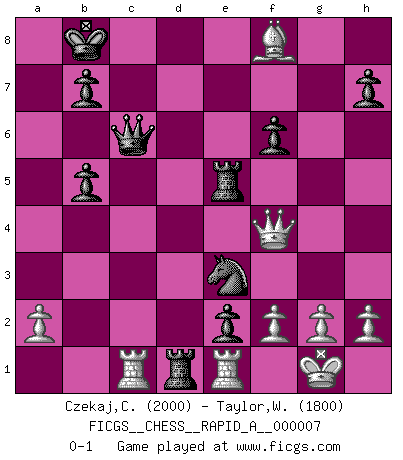 Last move : 0-1 2007 March 6 13:3:53 [Event "FICGS__CHESS__RAPID_A__000007"] [Site "FICGS"] [Date "2006.12.25"] [Round "1"] [White "Czekaj,Christophe"] [Black "Taylor,William"] [Result "0-1"] [WhiteElo "2000"] [BlackElo "1800"] 1.e4 c5 2.Nf3 d6 3.Bb5+ Bd7 4.Bxd7+ Qxd7 5.O-O Nc6 6.c3 Nf6 7.d4 Nxe4 8.d5 Ne5 9.Re1 Nf6 10.Nxe5 dxe5 11.c4 O-O-O 12.Nc3 Qf5 13.Qa4 Kb8 14.Be3 e6 15.dxe6 Qxe6 16.Bf4 Nd7 17.Qa5 Bd6 18.Be3 Bc7 19.Qb5 a6 20.Qb3 Nb6 21.Bxc5 Nxc4 22.Ne2 Rhe8 23.Rac1 Nb6 24.Qa3 Rd7 25.b4 e4 26.b5 Nc4 27.Qc3 axb5 28.Qxg7 f6 29.Qh6 Ba5 30.Nc3 Qc6 31.Qf4+ Re5 32.Bf8 e3 33.Rf1 Bxc3 34.Rxc3 e2 35.Re1 Rd1 36.Rc1 Ne3 0-1 Sicilian : Canal-Sokolsky attack, Bronstein gambit Kingside Castling by player White (move 5) Queenside Castling by player Black (move 11) Player Black won this chess game. Follow this game move after move (download)In the perfect Chess combination as in a first-rate short story, the whole plot and counter-plot should lead up to a striking finale, the interest not being allayed until the very last moment. (Yates and Winter) Ich bin Weltmeister und muß mit niemandem irgend etwas diskutieren. (Viswanathan Anand) Por la belleza de sus partidas, la claridad de su juego y lo brillante de sus ideas, Fischer se creó el mismo como un artista de la misma estatura como Brahms, Rembrandt y Shakespeare. (David Levy) Il a essayé de se convaincre qu'il pourrait empêcher toutes les erreurs et ne jamais perdre. L'horreur ! Gary Kasparov au sujet de Robert Fischer. The man who strikes first admits that his ideas have given out. (Chinese proverb)