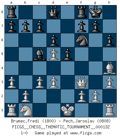 Last move : 1-0 2011 October 6 11:30:0 [Event "FICGS__CHESS__THEMATIC_TOURNAMENT__000132"] [Site "FICGS"] [Date "2011.06.30"] [Round "1"] [White "Brumec,Fredi"] [Black "Pech,Jaroslav"] [Result "1-0"] [WhiteElo "1800"] [BlackElo "0808"] 1.e4 e5 2.Bc4 Nf6 3.d3 Nc6 4.a3 Bc5 5.h3 O-O 6.Nf3 d6 7.Bg5 h6 8.Bh4 Be6 9.Bd5 Bxd5 10.exd5 Nd4 11.c3 Nxf3+ 12.Qxf3 1-0 This chess game has been lost on time (started : 2011.06.30 23:47:33) Bishop's Opening : Berlin defense Kingside Castling by player Black (move 5) Player White won this chess game. Follow this game move after move (download)A good sacrifice is one that is not necessarily sound but leaves your opponent dazed and confused. (Rudolph Spielmann) Es gibt Leute, die glauben, alles wäre vernünftig, was man mit einem ernsthaften Gesicht tut. (Georg Christoph Lichtenberg) Ser exitoso en el Ajedrez te permite descubrir tu propia personalidad. Eso es lo que deseo para los niños de mi clase. (Saudin Robovic) L'attaque fait le spectacle, la défense gagne les matchs. (Dicton footballistique) History is a gallery of pictures in which there are few originals and many copies. (Alexis de Tocqueville)