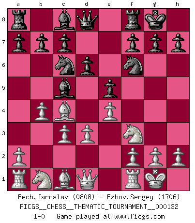 Last move : 1-0 2011 September 18 22:33:4 [Event "FICGS__CHESS__THEMATIC_TOURNAMENT__000132"] [Site "FICGS"] [Date "2011.06.30"] [Round "1"] [White "Pech,Jaroslav"] [Black "Ezhov,Sergey"] [Result "1-0"] [WhiteElo "0808"] [BlackElo "1706"] 1.e4 e5 2.Bc4 Nf6 3.d3 Nc6 4.Nf3 Bc5 5.O-O d6 6.c3 O-O 7.b4 1-0 This chess game has been lost on time (started : 2011.06.30 23:47:33) Bishop's Opening : Berlin defense Kingside Castling by player White (move 5) Kingside Castling by player Black (move 6) Player White won this chess game. Follow this game move after move (download)A bad plan is better than none at all. (Frank Marshall) Dein Körper muss in Topform sein. Dein Schach verfällt, wenn dein Körper verfällt. Der Körper kann nicht vom Geist getrennt werden. (Robert James Fischer) Tu no necesitas jugar muy bien, únicamente ayudar a tu oponenet a que juegue muy mal. (Genrikh Chepukaitis) C'est la seule position que je connaisse où les deux camps sont mals. Propos prêtés à V. Anand. Statistics can be made to prove anything - even the truth. (Author unknown)