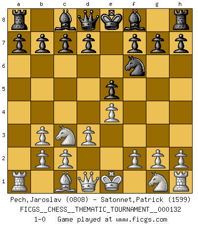 Last move : 1-0 2011 September 29 11:10:55 [Event "FICGS__CHESS__THEMATIC_TOURNAMENT__000132"] [Site "FICGS"] [Date "2011.06.30"] [Round "1"] [White "Pech,Jaroslav"] [Black "Satonnet,Patrick"] [Result "1-0"] [WhiteElo "0808"] [BlackElo "1599"] 1.e4 e5 2.Bc4 Nf6 3.Nc3 Nc6 4.d3 Na5 5.Bb3 Nxb3 6.axb3 1-0 This chess game has been lost on time (started : 2011.06.30 23:47:33) Bishop's Opening : Berlin defense Player White won this chess game. Follow this game move after move (download)The Pin is mightier than the sword. (Fred Reinfeld) Das Schach hält seine Meister in eigenen Banden, Fesseln; auf vielerlei Weise formt es ihren Geist, so dass die innere Freiheit selbst des Stärksten beeinflusst wird. (Albert Einstein) En partidas rápidas, el Caballo es mas poderoso que el Alfil. (Vlastimil Hort) Les échecs sont un jeu par leur forme, un art par leur essence et une science par sa difficulté d'acquisition. Ils peuvent vous procurer autant de plaisir qu'un bon livre ou une belle musique, mais vous n'aurez une réelle joie que si vous arrivez à bien jouer. (Tigran Petrosian) A married woman is like a fish riding a bicycle. (Rodolfo d'Ettorre)