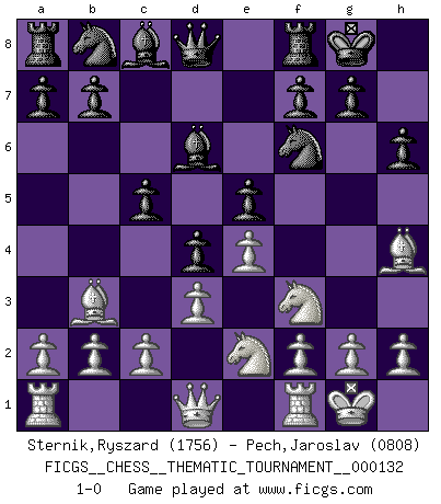 Last move : 1-0 2011 August 27 10:2:20 [Event "FICGS__CHESS__THEMATIC_TOURNAMENT__000132"] [Site "FICGS"] [Date "2011.06.30"] [Round "1"] [White "Sternik,Ryszard"] [Black "Pech,Jaroslav"] [Result "1-0"] [WhiteElo "1756"] [BlackElo "0808"] 1.e4 e5 2.Bc4 Nf6 3.d3 c6 4.Nf3 d5 5.Bb3 Bd6 6.Nc3 d4 7.Ne2 O-O 8.O-O c5 9.Bg5 h6 10.Bh4 1-0 This chess game has been lost on time (started : 2011.06.30 23:47:33) Bishop's Opening : Berlin defense Kingside Castling by player Black (move 7) Kingside Castling by player White (move 8) Player White won this chess game. Follow this game move after move (download)Bobby Fischer is the greatest Chess genius of all time ! (Alexander Kotov) Die Partien sind immer verschieden, die Interviews immer die gleichen. (Garry Kasparov) Cuando tu casa esta en llamas, no puedes ser molestado por tus vecinos. O, como decinos en Ajedrez, si tu Rey esta bajo ataque, no te preocupa perder un Peón del lado de la Reina. (Gary Kasparov) Ce qui caractérise les parties de combat, c'est que si le défenseur a constamment de difficiles problèmes à résoudre, l'attaquant doit chercher sans relâche de nouvelles possibilités d'attaque. (Koblentz) Perception is reality. (Immanuel Kant)