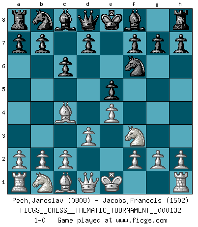 Last move : 1-0 2011 August 13 15:2:18 [Event "FICGS__CHESS__THEMATIC_TOURNAMENT__000132"] [Site "FICGS"] [Date "2011.06.30"] [Round "1"] [White "Pech,Jaroslav"] [Black "Jacobs,Francois"] [Result "1-0"] [WhiteElo "0808"] [BlackElo "1502"] 1.e4 e5 2.Bc4 Nf6 3.d3 c6 4.Nf3 1-0 Bishop's Opening : Berlin defense Player White won this chess game. Follow this game move after move (download)Discovered check is the dive bomber of the Chessboard. (Reuben Fine) Obwohl ich alt bin, darf mir niemand den Finger in den Mund stecken, sonst beisse ich. (Wilhelm Steinitz) En la perfecta combinación de Ajedrez como en una historia corta de primera clase, toda la trama y contra trama deberá conducir hacia un final sorprendente, el interes no es mitigado hasta el último momento. (Yates and Winter) On n'a jamais que l'âge auquel on a commence à jouer aux échecs car après on cesse de vieillir. (Capablanca) Good luck. You're gonna need it. (Han Solo in Star Wars ep.6)