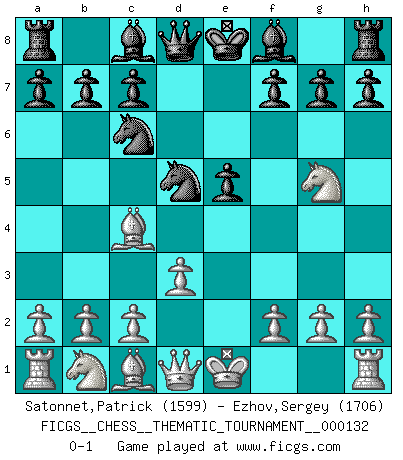 Last move : 0-1 2011 September 25 10:55:37 [Event "FICGS__CHESS__THEMATIC_TOURNAMENT__000132"] [Site "FICGS"] [Date "2011.06.30"] [Round "1"] [White "Satonnet,Patrick"] [Black "Ezhov,Sergey"] [Result "0-1"] [WhiteElo "1599"] [BlackElo "1706"] 1.e4 e5 2.Bc4 Nf6 3.d3 Nc6 4.Nf3 d6 5.Ng5 d5 6.exd5 Nxd5 0-1 This chess game has been lost on time (started : 2011.06.30 23:47:33) Bishop's Opening : Berlin defense Player Black won this chess game. Follow this game move after move (download)When you don't know what to do, wait for your opponent to get an idea - it's sure to be wrong. (Tarrasch) Bobby Fischer ist kein Vorbild für die heutige Jugend. (Viktor Kortschnoi) El Ajedrez lo es todo: arte, ciencia y deporte. (Anatoly Karpov) Si rien de grave n'est détecté lors de l'analyse d'une position, on joue alors le coup. Seconde règle de Blumenfeld. I've never seen so many men wasted so badly. (Blondie in The Good, The Bad and The Ugly)