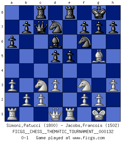 Last move : 0-1 2011 September 16 22:26:4 [Event "FICGS__CHESS__THEMATIC_TOURNAMENT__000132"] [Site "FICGS"] [Date "2011.06.30"] [Round "1"] [White "Simoni,Patucci"] [Black "Jacobs,Francois"] [Result "0-1"] [WhiteElo "1800"] [BlackElo "1502"] 1.e4 e5 2.Bc4 Nf6 3.d3 c6 4.Nf3 d5 5.exd5 cxd5 6.Bb5+ Bd7 7.Bxd7+ Nbxd7 8.O-O Bd6 9.Bg5 Qc7 10.Nc3 a6 11.a3 O-O 12.h3 Rac8 13.Re1 Rfe8 0-1 Bishop's Opening : Berlin defense Kingside Castling by player White (move 8) Kingside Castling by player Black (move 11) Player Black won this chess game. Follow this game move after move (download)The most powerful weapon in Chess is to have the next move. (David Bronstein) Privat ist Kortschnoi kein schlechter Mensch, sehr sympathisch. Aber während des Spiels ist er grausam. Er will dich töten. (Miguel Najdorf) Una victoria por una combinación errónea, aunque sea espectacular, me llena de horror artístico. (Wilhelm Steinitz) Echiquier : carré parfait, comme la Jérusalem nouvelle décrite par l'auteur de l'Apocalypse, huit cases sur huit, exaltation du chiffre 4, symbole du cosmos aux quatre horizons... où le noir et le blanc, l'ombre et la lumière, le mal et le bien s'entremêlent et se conjuguent. (Robert Couffignal, Le Gambit du poète) The modern world has divided itself into Conservatives and Progressives. The business of Progressives is to go on making mistakes. The business of the Conservatives is to prevent the mistakes from being corrected. (G.K. Chesterton)