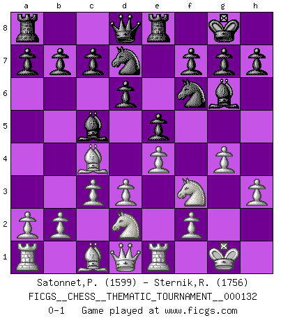 Last move : 0-1 2011 October 7 11:37:40 [Event "FICGS__CHESS__THEMATIC_TOURNAMENT__000132"] [Site "FICGS"] [Date "2011.06.30"] [Round "1"] [White "Satonnet,Patrick"] [Black "Sternik,Ryszard"] [Result "0-1"] [WhiteElo "1599"] [BlackElo "1756"] 1.e4 e5 2.Bc4 Nf6 3.d3 Bc5 4.Nf3 d6 5.c3 O-O 6.O-O Bg4 7.h3 Bh5 8.Re1 Nbd7 9.g4 Bg6 10.Nbd2 Re8 0-1 This chess game has been lost on time (started : 2011.06.30 23:47:33) Bishop's Opening : Berlin defense Kingside Castling by player Black (move 5) Kingside Castling by player White (move 6) Player Black won this chess game. Follow this game move after move (download)Chess opens and enriches your mind. (Saudin Robovic) Es gibt nur zwei wahre Schachgenies - das andere war Wilhelm Steinitz, der Weltmeister von 1872 bis 1894. (Robert James Fischer) No hay otro maestro que tenga una voluntad terrífica de ganar. Al tablero, el irradía peligro y aún los oponentes mas fuertes tienden a congelarse como liebres cuando olfatean a una pantera. Aún sus debilidades son peligrosas. Con las blancas, su juego de apertura es predecible - te es posible hacer planes en su contra - pero es tan fuerte que tus planes casi nunca funcionan. En el juego medio, su precisión e invención son fabulosas y en finales, tú simplemente no le puedes vencer. (Experto Alemán anónimo) Le plus grand jeu de l'esprit jamais inventé, plus vous l'apprenez, plus vous y prenez du plaisir. (Garry Kasparov) Games, world of games... There's always an opponent, and there's always a victim. (Revolver, movie)