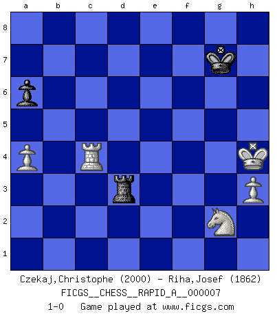 Last move : 1-0 2007 February 1 14:24:25 [Event "FICGS__CHESS__RAPID_A__000007"] [Site "FICGS"] [Date "2006.12.25"] [Round "1"] [White "Czekaj,Christophe"] [Black "Riha,Josef"] [Result "1-0"] [WhiteElo "2000"] [BlackElo "1862"] 1.e4 c5 2.Nf3 d6 3.Bb5+ Nc6 4.O-O Bd7 5.Re1 Nf6 6.c3 a6 7.Bf1 Bg4 8.d3 e6 9.Nbd2 Be7 10.h3 Bh5 11.g4 Bg6 12.Nh4 Nd7 13.Ng2 O-O 14.f4 h6 15.Nf3 Bh7 16.f5 Nde5 17.Be3 d5 18.Nxe5 Nxe5 19.d4 cxd4 20.cxd4 Nd7 21.e5 exf5 22.Bd3 fxg4 23.Bxh7+ Kxh7 24.Qxg4 Nb6 25.b3 Qd7 26.Qh5 Rac8 27.Rf1 g6 28.Qxh6+ Kg8 29.Rf6 Rc6 30.Raf1 Qd8 31.Rxc6 bxc6 32.e6 Nd7 33.exf7+ Rxf7 34.Qxg6+ Rg7 35.Qxc6 Nf6 36.Rf5 Kh7 37.Bg5 Qe8 38.Qxe8 Nxe8 39.Bxe7 Rxe7 40.Rxd5 Nc7 41.Rd8 Nb5 42.a4 Na3 43.d5 Rb7 44.d6 Rxb3 45.Rc8 Rd3 46.Rc7+ Kg8 47.d7 Kf8 48.Rc3 Rd1+ 49.Kh2 Nb1 50.Rc1 Rxd7 51.Rxb1 Rd4 52.Rf1+ Kg7 53.Rf4 Rd5 54.Kg3 Rd1 55.Kh4 Rd3 56.Rc4 1-0 Sicilian : Canal-Sokolsky (Nimzovich-Rossolimo, Moscow) attack Kingside Castling by player White (move 4) Kingside Castling by player Black (move 13) 10 pieces endgame at move 44 : White KRNPPP , Black KRNP WHITE : King + 1 Rook 1 Knight 3 Pawns BLACK : King + 1 Rook 1 Knight 1 Pawn 9 pieces endgame at move 50 : White KRNPP , Black KRNP WHITE : King + 1 Rook 1 Knight 2 Pawns BLACK : King + 1 Rook 1 Knight 1 Pawn 8 pieces endgame at move 51 : White KRNPP , Black KRP WHITE : King + 1 Rook 1 Knight 2 Pawns BLACK : King + 1 Rook 1 Pawn Player White won this chess game. Follow this game move after move (download)Good offense and good defense both begin with good development. (Bruce A. Moon) Im Fernschach kannst du während dem Spiel rauchen. (John Christen Knudsen) Bobby solo arroja las piezas y solas caen en las casillas correctas. (Miguel Najdorf ) La vie et les Echecs sont tous les deux une lutte constante. (Lasker) Good luck. You're gonna need it. (Han Solo in Star Wars ep.6)