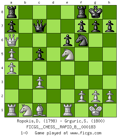 Last move : 1-0 2011 September 12 7:6:51 [Event "FICGS__CHESS__RAPID_B__000183"] [Site "FICGS"] [Date "2011.07.01"] [Round "1"] [White "Ropokis,Dimitrios"] [Black "Grguric,Samuel"] [Result "1-0"] [WhiteElo "1798"] [BlackElo "1800"] 1.d4 Nc6 2.e4 e6 3.Nf3 Bb4+ 4.c3 Ba5 5.Bd3 d5 6.a4 dxe4 7.Bxe4 Nf6 8.Bxc6+ bxc6 9.b4 O-O 10.bxa5 c5 11.O-O cxd4 12.Qxd4 Ba6 13.Re1 Bd3 14.Ne5 c5 15.Qxd3 Qc7 16.Qa6 1-0 Queen's pawn : Lundin (Kevitz-Mikenas) defense Kingside Castling by player Black (move 9) Kingside Castling by player White (move 11) Player White won this chess game. Follow this game move after move (download)Chess problems demand from the composer the same virtues that characterize all worthwhile art: originality, invention, conciseness, harmony, complexity, and splendid insincerity. (Vladimir Nabokov) Ich habe Putins Aufstieg an die Macht beobachtet und seine Politik, die demokratischen Institutionen meines Landes zu zerstören. (Garry Kasparov) El Ajedrez es un juego de pelea el cual es puramente intelectual e incluye la suerte. (Richard Reti) Le thème de l'attaque double intervient d'une manière ou d'une autre dans l'immense majorité des combinaisons. (Youri Averbakh) Programmer - an organism that turns coffee into software. (Anonymous)