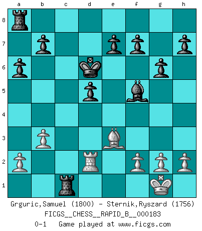 Last move : 0-1 2011 August 11 0:39:57 [Event "FICGS__CHESS__RAPID_B__000183"] [Site "FICGS"] [Date "2011.07.01"] [Round "1"] [White "Grguric,Samuel"] [Black "Sternik,Ryszard"] [Result "0-1"] [WhiteElo "1800"] [BlackElo "1756"] 1.Nf3 d5 2.d4 Nf6 3.Nc3 g6 4.b3 Bg7 5.e3 c5 6.dxc5 Ne4 7.Bb5+ Nc6 8.Nd4 Nxc3 9.Qd3 Nxb5 10.Qxb5 a6 11.Qd3 Qa5+ 12.Bd2 Qxc5 13.O-O Nxd4 14.exd4 Qxd4 15.Rae1 Qxd3 16.cxd3 Bf5 17.Rc1 Kd7 18.Rfe1 Rhc8 19.d4 Bxd4 20.Be3 Bb2 21.Rcd1 Kd6 22.Rd2 Bc3 23.Red1 Bxd2 24.Rxd2 Rc1+ 0-1 Reti Opening Kingside Castling by player White (move 13) Player Black won this chess game. Follow this game move after move (download)Chess is as much a mystery as women. (Purdy) Der 70jährige Viktor Kortschnoi: Die Rentenanstalt wollte mich zwingen in Rente zu gehen. Meine Frau erhält jetzt eine Pension- und ich zahle weiter in die Rentenkasse ein! (Viktor Kortschnoi) En el Ajedrez, tal como es jugado por los Maestros, practicamente la suerte es eliminada. (Emanuel Lasker) Les échecs sont un jeu par leur forme, un art par leur essence et une science par sa difficulté d'acquisition. Ils peuvent vous procurer autant de plaisir qu'un bon livre ou une belle musique, mais vous n'aurez une réelle joie que si vous arrivez à bien jouer. (Tigran Petrosian) The man who strikes first admits that his ideas have given out. (Chinese proverb)