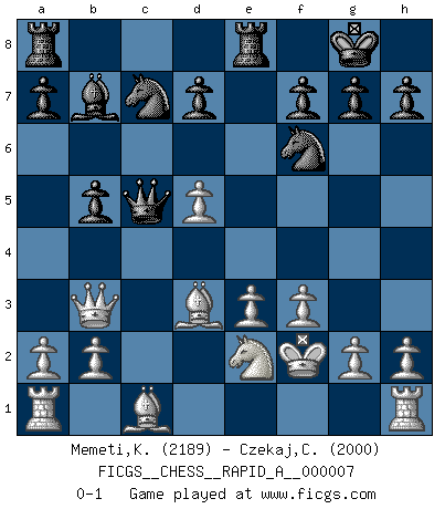 Last move : 0-1 2007 March 3 6:24:16 [Event "FICGS__CHESS__RAPID_A__000007"] [Site "FICGS"] [Date "2006.12.25"] [Round "1"] [White "Memeti,Kastriot"] [Black "Czekaj,Christophe"] [Result "0-1"] [WhiteElo "2189"] [BlackElo "2000"] 1.d4 Nf6 2.Bg5 c5 3.d5 Ne4 4.Bf4 Qb6 5.Bc1 e6 6.f3 Nf6 7.c4 exd5 8.cxd5 c4 9.e3 Bc5 10.Kf2 O-O 11.Bxc4 Re8 12.Qb3 Qd6 13.Ne2 Na6 14.Nbc3 Nc7 15.Na4 b5 16.Nxc5 Qxc5 17.Bd3 Bb7 0-1 This chess game has been lost on time (started : 2006.12.25 15:12:0) Trompowsky attack (Ruth, Opovcensky Opening) Kingside Castling by player Black (move 10) Player Black won this chess game. Follow this game move after move (download)Pawns: they are the soul of this game, they alone form the attack and defense. (Philidor) Stil? Ich habe keinen Stil! (Anatoly Karpov) Buenas posiciones no logran ganar juegos, buenas movidas sí. (Gerald Abrahams) Le profane ne songe pas à la somme de jouissance dont il se prive, qui méconnaît ce jeu aux ressources aussi variées que passionnantes. (Jean-Marie Jeanton-Lamarche) Never risk one's whole fortune unless supported by one's entire army. (Niccolo Machiavelli)