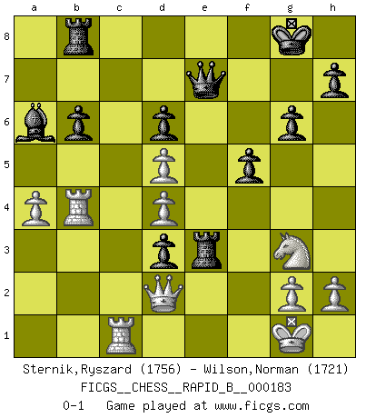 Last move : 0-1 2011 September 10 12:56:16 [Event "FICGS__CHESS__RAPID_B__000183"] [Site "FICGS"] [Date "2011.07.01"] [Round "1"] [White "Sternik,Ryszard"] [Black "Wilson,Norman"] [Result "0-1"] [WhiteElo "1756"] [BlackElo "1721"] 1.e4 c5 2.Nc3 e6 3.Nf3 Nc6 4.d4 cxd4 5.Nxd4 Nf6 6.Ndb5 d6 7.Bf4 e5 8.Nd5 Nxd5 9.exd5 Nb8 10.Be3 a6 11.Nc3 Be7 12.Bd3 O-O 13.O-O f5 14.f4 e4 15.Be2 Nd7 16.a4 b6 17.Qd2 Bf6 18.Bf2 Bb7 19.Nd1 Qc7 20.Ra3 Rac8 21.c3 g6 22.Ne3 Nc5 23.Nc4 a5 24.Rd1 Ba6 25.Re1 Rb8 26.Bd4 Nd3 27.Bxd3 exd3 28.Ne3 Bxd4 29.cxd4 Rfe8 30.b4 axb4 31.Rb3 Re4 32.Rxb4 Rxf4 33.Rc1 Qe7 34.Nf1 Re4 35.Ng3 Re3 0-1 Sicilian : Closed Kingside Castling by player Black (move 12) Kingside Castling by player White (move 13) Player Black won this chess game. Follow this game move after move (download)In Chess, at least, the brave inherit the earth. (Edmar Mednis) Woher wissen wir, daß der Neanderthaler Blindschach gespielt hat? -- Bei Ausgrabungen wurden keine Schachbretter und Figuren gefunden. (Anonymous) Nunca nadie ha ganado una partida de Ajedrez rindiendose. (Unknown) Les sacrifices démontrent seulement que quelqu'un a gaffé. (Savielly Tartacover) Life is pleasant. Death is peaceful. It's the transition that's troublesome. (Isaac Asimov)