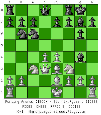 Last move : 0-1 2011 August 27 10:2:20 [Event "FICGS__CHESS__RAPID_B__000183"] [Site "FICGS"] [Date "2011.07.01"] [Round "1"] [White "Ponting,Andrew"] [Black "Sternik,Ryszard"] [Result "0-1"] [WhiteElo "1800"] [BlackElo "1756"] 1.d4 Nf6 2.c4 g6 3.Nc3 Bg7 4.Nf3 d5 5.Qb3 dxc4 6.Qxc4 O-O 7.e4 Nfd7 8.Be2 Nb6 9.Qd3 Bg4 10.Be3 Nc6 0-1 This chess game has been lost on time (started : 2011.07.01 14:37:25) King's Indian defense, 3.Nc3 Kingside Castling by player Black (move 6) Player Black won this chess game. Follow this game move after move (download)As one by one I mowed them down, my superiority soon became apparent. (Jose Capablanca) Jeder Fehler erscheint unglaublich dumm, wenn andre ihn begehen. (Georg Christoph Lichtenberg) El Ajedrez es tan inspirador que yo no creo que un buen jugador sea capaz de tener un pensamiento malo durante una partida. (Wilhelm Steinitz) Votre prénom est 'Tactique', votre deuxième prénom est 'Tactique' et votre nom est 'Tactique'. (Ken Smith) You can think I'm wrong, but that's no reason to quit thinking. (Gregory House, House M.D.)
