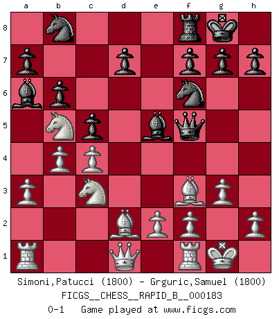 Last move : 0-1 2011 August 30 10:8:13 [Event "FICGS__CHESS__RAPID_B__000183"] [Site "FICGS"] [Date "2011.07.01"] [Round "1"] [White "Simoni,Patucci"] [Black "Grguric,Samuel"] [Result "0-1"] [WhiteElo "1800"] [BlackElo "1800"] 1.c4 e5 2.Nc3 b6 3.d4 Qh4 4.g3 Qf6 5.dxe5 Qxe5 6.Nf3 Qa5 7.Bg2 Bb4 8.Bd2 Nf6 9.O-O Ba6 10.a3 Bd6 11.b4 Qh5 12.Nd4 c5 13.Ndb5 Be5 14.Bxa8 O-O 15.Bf3 Qf5 0-1 This chess game has been lost on time (started : 2011.07.01 14:37:25) English Opening Kingside Castling by player White (move 9) Kingside Castling by player Black (move 14) Player Black won this chess game. Follow this game move after move (download)Openings teach you openings. Endgames teach you chess ! (Stephan Gerzadowicz) Der zweitbeste Zug ist oft der einzig richtige. (Savielly Grigorievitsch Tartakower) La estratégia requiere pensar, la táctica requiere observación. (Max Euwe) Si rien de grave n'est détecté lors de l'analyse d'une position, on joue alors le coup. Seconde règle de Blumenfeld. The only sure thing about luck is that it will change. (Wilson Mizner)