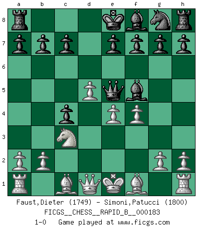 Last move : 1-0 2011 July 12 11:25:16 [Event "FICGS__CHESS__RAPID_B__000183"] [Site "FICGS"] [Date "2011.07.01"] [Round "1"] [White "Faust,Dieter"] [Black "Simoni,Patucci"] [Result "1-0"] [WhiteElo "1749"] [BlackElo "1800"] 1.d4 d5 2.c4 dxc4 3.e4 Nc6 4.d5 Ne5 5.Nf3 Qd6 6.Nxe5 Qxe5 7.Nc3 Bf5 8.f4 1-0 QGA : 3.e4 Player White won this chess game. Follow this game move after move (download)If I win a tournament, I win it by myself. I do the playing. Nobody helps me. (Bobby Fischer) Es hat in meinem Leben Zeiten gegeben, da ich sehr nahe daran war zu glauben, daß ich auch nicht eine einzige Schachpartie verlieren könnte. (José Raúl Capablanca) Estaba muy claro de que el punto vulnerable del Gran Maestro Americano (Bobby Fischer) radicaba en las posiciones de doble filo, colgantes, irracionales, donde el siempre falló en encontrar un triunfo aún en una posición de clara victoria. (Efim Geller) A ce moment-là, je menaçais de comprendre la position ! (Clément L'Heureux) Whoever said the pen is mightier than the sword obviously never encountered automatic weapons. (US General Douglas MacArthur)