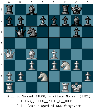 Last move : 0-1 2011 August 11 2:15:45 [Event "FICGS__CHESS__RAPID_B__000183"] [Site "FICGS"] [Date "2011.07.01"] [Round "1"] [White "Grguric,Samuel"] [Black "Wilson,Norman"] [Result "0-1"] [WhiteElo "1800"] [BlackElo "1721"] 1.g3 g6 2.d4 Bg7 3.e4 c5 4.dxc5 Qa5+ 5.c3 Qxc5 6.Be3 Qc7 7.Nd2 Nf6 8.Qa4 O-O 9.Bc4 Ng4 10.Ngf3 Nxe3 11.fxe3 Nc6 12.O-O Qb6 0-1 Benko's Opening Kingside Castling by player Black (move 8) Kingside Castling by player White (move 12) Player Black won this chess game. Follow this game move after move (download)All Chess players should have a hobby. (Savielly Tartakower) Schach ist wie eine schöne Frau, zu der wir ständig zurückkehren, gleichviel, wie oft sie uns zurückweist. (Anonymous) Es muy difícil jugar en contra de la teoría de Einstein. - en su primera derrota en contra de Fischer (Mikhail Tal) Mais n'est-ce pas déjà le limiter injurieusement que d'appeler les échecs un jeu? N'est-ce pas aussi une science, un art, ou quelque chose qui, comme le cercueil de Mahomet entre ciel et terre, est suspendu entre l'un et l'autre, et qui réunit un nombre incroyable de contraires ? (Stefan Zweig) To err is human, but to really foul things up requires a computer. (Farmer's Almanac, 1978)