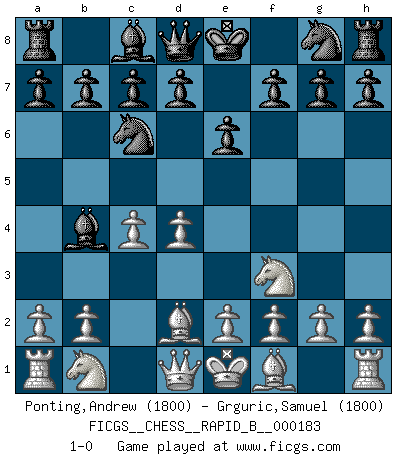 Last move : 1-0 2011 August 11 2:15:52 [Event "FICGS__CHESS__RAPID_B__000183"] [Site "FICGS"] [Date "2011.07.01"] [Round "1"] [White "Ponting,Andrew"] [Black "Grguric,Samuel"] [Result "1-0"] [WhiteElo "1800"] [BlackElo "1800"] 1.d4 e6 2.c4 Bb4+ 3.Bd2 Nc6 4.Nf3 1-0 Queen's pawn : Franco-Indian (Keres) defense Player White won this chess game. Follow this game move after move (download)White lost because he failed to remember the right continuation and had to think up the moves himself. (Siegbert Tarrasch) Nicht daß Diemer aus Opportunismus Mitglied der NSDAP geworden wäre. Er war ein Fanatiker, in allem, was er tat. (Hans Ree) Un buen sacrificio es aquel que aunque no sea necesariamente sólido, deja a tu oponente aturdido y confuso. (Rudolph Spielmann) Les échecs sont un jeu terrible. Si vous n'avez pas le centre, votre adversaire a une position plus libre. Par contre, si vous avez le centre, alors vous avez vraiment quelque chose pour laquelle vous inquiéter ! (Siegbert Tarrasch) . 'gn is not allowed in chess unless n is an integer between 1 and 8 inclusive, where 1 and 8 are to interpreted as the standard numerals standing for integers in the ordered real-closed field R, with the *canonical* ordering. (As opposed to, say, an integer in the domain Z[2+i*sqrt(5)] or an integer in some exotic Grothendieck topos). (Normajean Yates)