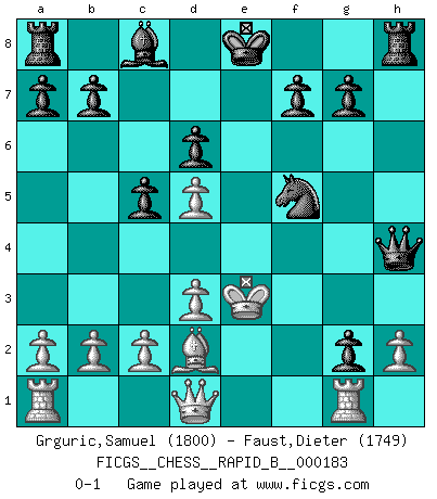 Last move : 0-1 2011 August 11 2:16:4 [Event "FICGS__CHESS__RAPID_B__000183"] [Site "FICGS"] [Date "2011.07.01"] [Round "1"] [White "Grguric,Samuel"] [Black "Faust,Dieter"] [Result "0-1"] [WhiteElo "1800"] [BlackElo "1749"] 1.e4 e6 2.Nc3 c5 3.d3 Nc6 4.g3 d6 5.Bh3 Nf6 6.f4 Be7 7.Nf3 h5 8.f5 exf5 9.Nd5 h4 10.Bd2 hxg3 11.Bxf5 g2 12.Rg1 Nxd5 13.exd5 Bh4+ 14.Nxh4 Qxh4+ 15.Ke2 Nd4+ 16.Ke3 Nxf5+ 0-1 French defense Player Black won this chess game. Follow this game move after move (download)In a gambit you give up a Pawn for the sake of getting a lost game. (Samuel Standige Boden) Schach ist das Spiel, das die Verrückten gesund hält. (Albert Einstein) El Ajedrez es un mar en el cual un mosquito puede beber y un elefante puede bañarse. (Refrán Hindú) Il n'y a pas eu de défaite parce que je ne crois pas que cet ordinateur ait jamais existé. IBM a triché en refusant d'imprimer les modes de recherche de la machine. C'est évident, pendant le match, des coups décisifs ont été joués par des êtres humains. Aujourd'hui, les meilleurs spécialistes en informatique ne peuvent toujours pas expliquer comment Deep-Blue a pu jouer contre la logique des ordinateurs. IBM a gagné une guerre de communication, mais ils sont incapables de prouver que l'ordinateur a gagné tout seul. (Garry Kasparov) I couldn't make any sense out of what this particular thread is about. It sounds like R2 D2 computer speaking. A space fight ?!? Some 'command' problems in Moscow ? Some killers & narcotic addicts attacking some game & a god wannabe ?? (Dinesh De Silva, lost in a russian conflict in FICGS forum)