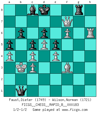Last move : 1/2-1/2 2011 September 25 12:8:46 [Event "FICGS__CHESS__RAPID_B__000183"] [Site "FICGS"] [Date "2011.07.01"] [Round "1"] [White "Faust,Dieter"] [Black "Wilson,Norman"] [Result "1/2-1/2"] [WhiteElo "1749"] [BlackElo "1721"] 1.d4 Nf6 2.c4 e6 3.Nc3 Bb4 4.Nf3 c5 5.e3 Bxc3+ 6.bxc3 d6 7.Bd3 Nc6 8.O-O O-O 9.h3 e5 10.d5 Ne7 11.e4 Ng6 12.Re1 Bd7 13.a4 Qa5 14.Bf1 h6 15.Bd2 Rfe8 16.g3 Qc7 17.Qc2 b6 18.Kh2 Rf8 19.Be3 Rfe8 20.Ra2 Rab8 21.Rb1 a6 22.Bg2 Rbd8 23.Ne1 Rb8 24.Nd3 Red8 25.Qe2 Rb7 26.Bf3 Rdb8 27.Rh1 Nf8 28.Qd2 Re8 29.Rb1 R7b8 30.Qc2 N8h7 31.Bg2 Nf8 32.Rba1 a5 33.Re1 Ng6 34.Bd2 Qb7 35.Qd1 Rf8 36.f4 Qc7 37.f5 Ne7 38.Be3 Bc8 39.g4 Ba6 40.Qb3 Kh7 41.Bf3 Rh8 42.g5 hxg5 43.Bxg5 Ne8 44.Rg2 Kg8 45.Kg3 Kf8 46.h4 Ng8 47.h5 Nef6 48.Kf2 Rh7 49.Rh1 Bc8 50.Ke3 Bd7 51.Bd1 Bc8 52.Nf2 Ba6 53.Kd3 Qc8 54.Kc2 Qe8 55.Bf3 Ke7 56.Rhg1 Kd7 57.Bxf6 Nxf6 58.Rxg7 Rxg7 59.Rxg7 Ke7 60.Rg2 Qf8 61.Ng4 Nxh5 62.Rh2 Nf6 63.Nxf6 Kxf6 64.Qb1 Qg7 65.Qh1 Ke7 66.Rh6 Qg3 67.Kb3 Rg8 68.f6+ Kd8 69.Rh8 Bc8 70.Rh7 Qg6 71.Rh6 Qg5 72.Qh5 Qc1 73.Qxf7 Qb1+ 74.Ka3 Qa1+ 75.Kb3 Qb1+ 76.Ka3 Qa1+ 77.Kb3 Qb1+ 1/2-1/2 Nimzo-Indian : Three knights variation Kingside Castling by player White (move 8) Kingside Castling by player Black (move 8) This chess game ended in a draw. Follow this game move after move (download)The Chess pieces are the block alphabet which shapes thoughts; and these thoughts, although making a visual design on the chessboard, express their beauty abstractly, like a poem. (Marcel Duchamp) Ich bin der einzige Schachspieler, der sich während der Vorbereitungen zum Turnier verletzt hat. (Woody Allen) No soy una persona materialista y por eso, no resiento la falta o pérdida del dinero. La ausencia de cosas mundanas carece de importancia. Ya que el Ajedrez es una forma en la que puedo ser tan materialista como yo desee sin tener la necesidad de vender mi alma. (Jamie Walter Adams) La guerre est enfant de la passion, la passion est enfant du narcissisme et le narcissisme est l'enfant. (...) Une autre partie ? (Thibault de Vassal) Employ the attack like tactic of defense. (Chinese proverb)