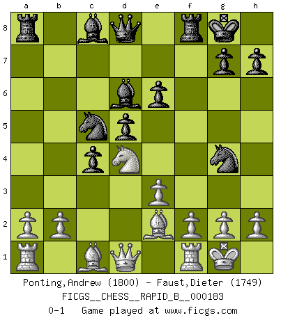 Last move : 0-1 2011 August 20 16:17:20 [Event "FICGS__CHESS__RAPID_B__000183"] [Site "FICGS"] [Date "2011.07.01"] [Round "1"] [White "Ponting,Andrew"] [Black "Faust,Dieter"] [Result "0-1"] [WhiteElo "1800"] [BlackElo "1749"] 1.d4 e6 2.c4 Nf6 3.Nf3 c5 4.d5 b5 5.dxe6 fxe6 6.cxb5 d5 7.e3 a6 8.bxa6 c4 9.Be2 Nxa6 10.O-O Nc5 11.Nc3 Bd6 12.Nb5 Be7 13.Ne5 O-O 14.Nd4 Bd6 15.Ng4 Nxg4 0-1 Queen's pawn Kingside Castling by player White (move 10) Kingside Castling by player Black (move 13) Player Black won this chess game. Follow this game move after move (download)Bobby is the most misunderstood, misquoted celebrity walking the face of this earth. (Yasser Seirawan) Wenn es im Universum noch irgendwo intelligente Lebewesen gibt, dann kennen sie Go. (Emanuel Lasker) Jugadores de primera clase pierden en contra de jugadores de segunda clase porque los jugadores de segunda clase a veces juegan una partida de primer clase. (Siegbert Tarrasch) Les réformistes prétendent que les progrès de la théorie conduiront à la disparition des échecs, et qu'il faut, pour leur rendre vie, en remanier les règles. En réalité, qu'exprime cette affirmation? Le mépris de l'intuition, de l'imagination et de tous les autres éléments qui font des échecs un art. (Alexander Alekhine) Knowledge rests not upon truth alone, but upon error also. (Carl G. Jung)