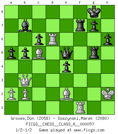 Last move : 1/2-1/2 2011 July 13 8:12:51 [Event "FICGS__CHESS__CLASS_A__000097"] [Site "FICGS"] [Date "2011.07.02"] [Round "1"] [White "Groves,Don"] [Black "Soszynski,Marek"] [Result "1/2-1/2"] [WhiteElo "2058"] [BlackElo "2080"] 1.Nf3 d5 2.d4 Nf6 3.c4 e6 4.Nc3 c6 5.e3 Nbd7 6.Qc2 Bd6 7.Bd3 O-O 8.O-O dxc4 9.Bxc4 b5 10.Bd3 Bb7 11.Ng5 Bxh2+ 12.Kxh2 Ng4+ 13.Kg1 Qxg5 14.f3 Ngf6 15.e4 Qh4 16.Be3 e5 17.Ne2 a5 18.Rfd1 Nh5 19.g4 Ng3 20.Kg2 Nxe2 21.Bxe2 Qf6 22.g5 Qg6 23.dxe5 Nxe5 24.Kg3 Rae8 25.Rac1 h6 26.f4 f5 27.Bc5 fxe4 28.Qb3+ Rf7 29.fxe5 Rxe5 30.Kh2 Rxg5 31.Rd6 Qf5 32.Rf1 Qe5+ 1/2-1/2 Reti Opening Kingside Castling by player Black (move 7) Kingside Castling by player White (move 8) This chess game ended in a draw. Follow this game move after move (download)Methodical thinking is of more use in Chess than inspiration. (C. J. S. Purdy) Der Traum, für den ich lebe, ist der von einem freien Russland. Viele mögen sagen: Russland hat doch ein Parlament, einen gewählten Präsidenten. Aber ich spüre, dass in meiner Heimat die Angst wiederkehrt. Eine Angst, sich frei zu äußern, bestimmte Dinge zu tun (Garry Kasparov) Yo jugué Ajedrez con el y a veces le pude haber ganado solo que siempre devuelve su última jugada y juega la partida de manera diferente. (Mark Twain) Vouloir jouer aux échecs contre soi-même est aussi paradoxal que vouloir marcher sur son ombre. (Stefan Zweig) It's only after you lost everything, Tyler says, that you're free to do anything. (Chuck Palahniuk, Fight Club)