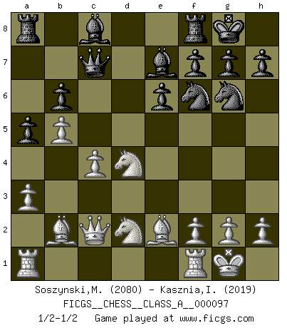 Last move : 1/2-1/2 2011 July 17 11:33:8 [Event "FICGS__CHESS__CLASS_A__000097"] [Site "FICGS"] [Date "2011.07.02"] [Round "1"] [White "Soszynski,Marek"] [Black "Kasznia,Ireneusz"] [Result "1/2-1/2"] [WhiteElo "2080"] [BlackElo "2019"] 1.e4 c5 2.d4 cxd4 3.Qxd4 Nc6 4.Qe3 Nf6 5.Nf3 d5 6.exd5 Nxd5 7.Qb3 a6 8.c4 Na5 9.Qa3 e6 10.Qd3 Qc7 11.Nbd2 Nf6 12.a3 Nc6 13.Be2 Be7 14.O-O O-O 15.b4 a5 16.b5 Ne5 17.Qc2 Ng6 18.Bb2 b6 19.Nd4 1/2-1/2 Sicilian : Smith-Morra gambit Kingside Castling by player White (move 14) Kingside Castling by player Black (move 14) This chess game ended in a draw. Follow this game move after move (download)Let the perfectionist play postal. (Yasser Seirawan) Ohne ihre Erfolge schmälern zu wollen würde ich sagen Petrosian, Spassky und Karpov verdanken ihre Siege ihren Trainern - Boleslavsky, Bondarevsky und Furman. (Mikhail Moiseyevich Botvinik) Desconfianza es la característica mas necesaria de un jugador de Ajedrez. (Siegbert Tarrasch) L'action d'une oeuvre littéraire se déroule sur un champ de bataille. Les masques et les types du drame moderne correspondent aux pièces du jeu d'échecs. L'intrigue correspond aux coups et aux gambits, c'est à dire aux techniques du jeu telles qu'utilisées et interprétées par les joueurs. Les tactiques et les péripéties [mouvements] correspondent aux coups exécutés par l'adversaire. (Viktor Shklovsky) Quotation,n.: The act of repeating erroneously the words of another. The words erroneously repeated. (Ambrose Bierce, The Devil's Dictionary)