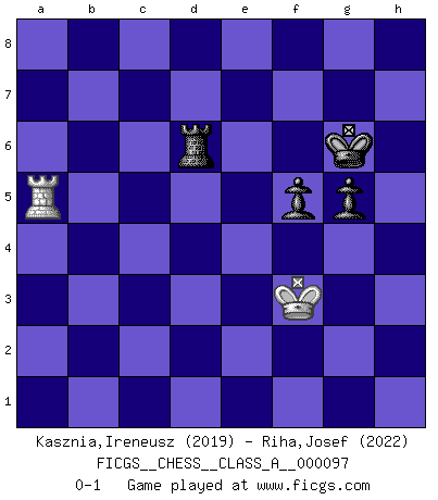 Last move : 0-1 2011 August 30 20:28:19 [Event "FICGS__CHESS__CLASS_A__000097"] [Site "FICGS"] [Date "2011.07.02"] [Round "1"] [White "Kasznia,Ireneusz"] [Black "Riha,Josef"] [Result "0-1"] [WhiteElo "2019"] [BlackElo "2022"] 1.d4 Nf6 2.c4 g6 3.Nc3 d5 4.Nf3 Bg7 5.Bf4 O-O 6.e3 c5 7.dxc5 Ne4 8.Rc1 Nd7 9.cxd5 Qa5 10.Be2 Nxc3 11.bxc3 Bxc3+ 12.Kf1 Nxc5 13.Qc2 Na4 14.Bg5 Bd7 15.Qb3 Rfc8 16.g4 Bb4 17.Rb1 Bd6 18.e4 Nc5 19.Qe3 f6 20.Bh6 Qxa2 21.Kg2 Bxg4 22.h3 Bxf3+ 23.Bxf3 b6 24.h4 Nb7 25.Ra1 Qb2 26.Rab1 Qe5 27.Qe2 Rc3 28.Bc1 Nc5 29.Bb2 Na4 30.Ba1 Qf4 31.h5 g5 32.h6 Ra3 33.Bg4 Nc5 34.Bf5 Nd3 35.Bb2 Nxf2 36.Bxa3 Qg3+ 37.Kf1 Nxh1 38.Bxd6 exd6 39.Rd1 Qe5 40.Be6+ Qxe6 41.dxe6 Ng3+ 42.Kf2 Nxe2 43.Kxe2 Kf8 44.Rxd6 Ke7 45.Rd7+ Kxe6 46.Rxh7 a5 47.Rb7 a4 48.h7 Rh8 49.Rxb6+ Ke5 50.Ra6 Kxe4 51.Rxa4+ Kf5 52.Ra7 Kg6 53.Kf3 Rxh7 54.Ra6 Re7 55.Kg4 Re4+ 56.Kf3 Rd4 57.Kg3 Kf5 58.Ra3 Rd6 59.Ra5+ Kg6 60.Kf3 f5 0-1 King's Indian defense, 3.Nc3 Kingside Castling by player Black (move 5) 10 pieces endgame at move 46 : White KRPP , Black KRPPPP WHITE : King + 1 Rook 2 Pawns BLACK : King + 1 Rook 4 Pawns 9 pieces endgame at move 49 : White KRPP , Black KRPPP WHITE : King + 1 Rook 2 Pawns BLACK : King + 1 Rook 3 Pawns 8 pieces endgame at move 50 : White KRP , Black KRPPP WHITE : King + 1 Rook 1 Pawn BLACK : King + 1 Rook 3 Pawns 7 pieces endgame at move 51 : White KRP , Black KRPP WHITE : King + 1 Rook 1 Pawn BLACK : King + 1 Rook 2 Pawns 6 pieces endgame at move 53 : White KR , Black KRPP WHITE : King + 1 Rook BLACK : King + 1 Rook 2 Pawns Player Black won this chess game. Follow this game move after move (download)We must make sure that Chess will not be like a dead language, very interesting, but for a very small group. (Sytze Faber) Eine Person mit durchschnittlichem IQ kann etwa eine ELO von 2000 erreichen. (Jonathan Levitt) La táctica fluye a partir de una posición superior. (Bobby Fischer) Demandez au pauvre Cg1 ce qu'il en pense. Eduard Gufeld à propos de la variante Saemisch de l'Est-Indienne. Chess is as much a mystery as women. (Purdy)