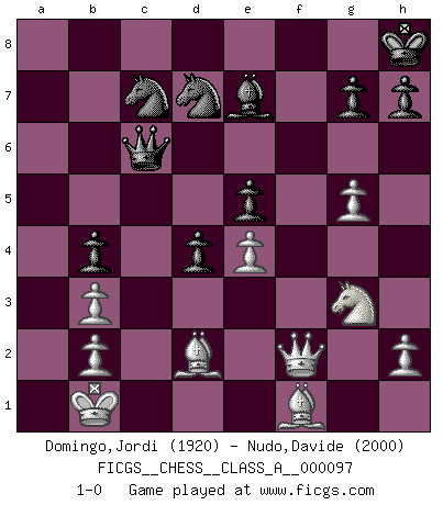 Last move : 1-0 2011 November 11 0:34:55 [Event "FICGS__CHESS__CLASS_A__000097"] [Site "FICGS"] [Date "2011.07.02"] [Round "1"] [White "Domingo,Jordi"] [Black "Nudo,Davide"] [Result "1-0"] [WhiteElo "1920"] [BlackElo "2000"] 1.e4 c5 2.Nf3 d6 3.d4 cxd4 4.Nxd4 Nf6 5.Nc3 a6 6.Be3 e5 7.Nb3 Be6 8.f3 Be7 9.Qd2 O-O 10.O-O-O Nbd7 11.g4 b5 12.g5 b4 13.Ne2 Ne8 14.f4 a5 15.f5 a4 16.fxe6 axb3 17.cxb3 fxe6 18.Bh3 Rxa2 19.Bxe6+ Kh8 20.Ng3 Nc7 21.Bc4 Qa8 22.Rhf1 Ra1+ 23.Kc2 Rxf1 24.Rxf1 Rxf1 25.Bxf1 d5 26.Qf2 Qc6+ 27.Kb1 d4 28.Bd2 1-0 Sicilian : Najdorf, Byrne (English) attack Kingside Castling by player Black (move 9) Queenside Castling by player White (move 10) Player White won this chess game. Follow this game move after move (download)The enormous mental resilience, without which no Chess player can exist, was so much taken up by Chess that he could never free his mind of this game. (Albert Einstein) Ein Gewinn durch eine ungenaue Kombination, sei sie auch noch so vorzeigbar, erfüllt mich mit Schaudern. (Wilhelm Steinitz) El Ajedrez es un juego terrible. Si no dominas el centro, tu oponente tiene una posición mas libre. Si tu tienes el centro, entonces realmente tienes algo de que preocuparte. (Siegbert Tarrasch) Les Echecs ont trois composantes : le temps, l'espace et le matériel en dernier. (Mikhail Tal) Perfection is achieved, not when there is nothing more to add, but when there is nothing left to take away. (Antoine de Saint-Exupéry)