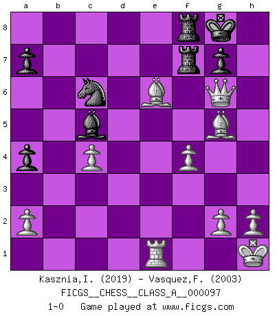 Last move : 1-0 2012 January 7 3:51:10 [Event "FICGS__CHESS__CLASS_A__000097"] [Site "FICGS"] [Date "2011.07.02"] [Round "1"] [White "Kasznia,Ireneusz"] [Black "Vasquez,Fernando"] [Result "1-0"] [WhiteElo "2019"] [BlackElo "2003"] 1.d4 d5 2.c4 dxc4 3.Nf3 Nf6 4.e3 Be6 5.Nc3 c6 6.Ng5 Bd5 7.e4 h6 8.exd5 hxg5 9.dxc6 Nxc6 10.d5 Ne5 11.Bxg5 Nfd7 12.Be2 Rc8 13.O-O Nc5 14.b3 Qa5 15.Qd4 Ncd3 16.f4 e6 17.Na4 b5 18.dxe6 bxa4 19.exf7+ Nxf7 20.Qe4+ Kd7 21.bxc4 Nb4 22.Qb7+ Rc7 23.Rad1+ Nd6 24.Bg4+ Ke8 25.Rfe1+ Kf7 26.Be6+ Kg6 27.Qf3 Rf7 28.Qg4 Kh7 29.Rxd6 Qc7 30.Rd7 Bc5+ 31.Kh1 Qxd7 32.Bxd7 Rhf8 33.Be6 Nc6 34.Qh5+ Kg8 35.Qg6 1-0 QGA, Flohr variation Kingside Castling by player White (move 13) Player White won this chess game. Follow this game move after move (download)It's just you and your opponent at the board and you're trying to prove something. (Bobby Fischer) Im Leben werden Partien nie so unstrittig gewonnen wie im Spiel (Emanuel Lasker) No es tiempo de jugar al Ajedrez cuando la casa esta en llamas. (Proverbio Italiano) L'ordinateur a tué l'originalité. Il n'y a plus guère d'aventures sur l'échiquier. (Jacob Murray) The weakness of an artist is dogma. (Josh Waitzkin)