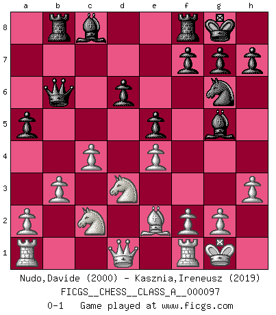 Last move : 0-1 2011 October 30 1:2:50 [Event "FICGS__CHESS__CLASS_A__000097"] [Site "FICGS"] [Date "2011.07.02"] [Round "1"] [White "Nudo,Davide"] [Black "Kasznia,Ireneusz"] [Result "0-1"] [WhiteElo "2000"] [BlackElo "2019"] 1.e4 c5 2.Nf3 Nc6 3.d4 cxd4 4.Nxd4 e5 5.Nb5 d6 6.N1c3 a6 7.Na3 b5 8.Nd5 Nf6 9.Bg5 Be7 10.Bxf6 Bxf6 11.c4 b4 12.Nc2 O-O 13.Be2 Bg5 14.O-O Rb8 15.h3 Ne7 16.Ndxb4 a5 17.Nd3 Qb6 18.b3 Ng6 0-1 This chess game has been lost on time (started : 2011.07.02 5:38:32) Sicilian : Labourdonnais-Loewenthal (Kalashnikov) variation Kingside Castling by player Black (move 12) Kingside Castling by player White (move 14) Player Black won this chess game. Follow this game move after move (download)Any material change in a position must come about by mate, a capture, or a Pawn promotion. (Purdy) Die Jungen erwarten, dass Opa einfach umfällt. Dann aber kann Opa fünf Stunden lang Schach spielen und die jungen Gegner an die Wand drücken. (Viktor Kortschnoi) Yo adoro todas la posiciones. Denme una partida posicional difícil, y la jugaré. Pero posiciones totalmente ganadas, no las tolero. (Hein Donner) Le temps de noter son nom sur la feuille de partie, j'étais déjà en zeitnot ! D'un modeste amateur apparié lors de la première ronde d'un open contre le grand-maître Azmaïparashvili. There are 10 types of people in this world: those who understand binary and those who don't. (Anonymous)