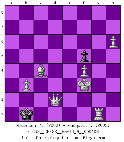 Last move : 1-0 2011 October 19 10:25:18 [Event "FICGS__CHESS__RAPID_A__000108"] [Site "FICGS"] [Date "2011.07.02"] [Round "1"] [White "Anderson,Peter W."] [Black "Vasquez,Fernando"] [Result "1-0"] [WhiteElo "2000"] [BlackElo "2003"] 1.d4 d5 2.c4 dxc4 3.e4 Nc6 4.Nf3 Bg4 5.d5 Ne5 6.Bf4 Bxf3 7.gxf3 Ng6 8.Qa4+ c6 9.dxc6 b5 10.Qxb5 Nxf4 11.c7 Qd7 12.Bxc4 e6 13.Qb7 Ke7 14.Ba6 Nd3+ 15.Kf1 Nc5 16.Qxa8 Qxc7 17.Bb5 Nf6 18.Nc3 g5 19.Rd1 Bg7 20.Qc6 Qxc6 21.Bxc6 Rc8 22.Bb5 Rb8 23.h4 g4 24.b4 Nfxe4 25.Nxe4 Nxe4 26.Rd7+ Kf8 27.Bc6 Nc3 28.b5 Nxb5 29.fxg4 Nc3 30.Rh3 Rb1+ 31.Kg2 Ne2 32.Rb3 Rxb3 33.axb3 a5 34.Ra7 Nc1 35.Ra8+ Ke7 36.Ba4 Nd3 37.g5 Ne1+ 38.Kg3 Bb2 39.Rxa5 Nd3 40.Bb5 Nb4 41.Ra7+ Kf8 42.f4 Bd4 43.Rb7 Bc5 44.Bc4 Be7 45.Rb8+ Kg7 46.h5 Bf8 47.h6+ Kg8 48.Re8 Nc6 49.Bd3 f5 50.Bc4 Kf7 51.Rxe6 Na5 52.Bd5 Ba3 53.Ra6 Ke7 54.Rxa5 Bb4 55.Ra7+ Kd6 56.Bc4 Kc5 57.Rxh7 Bc3 58.g6 Kb4 59.g7 Be1+ 60.Kf3 Bc3 61.g8Q Bd4 62.Qd5 Kc3 63.Rd7 Kc2 64.Qxd4 Kb1 65.Qd2 Ka1 66.Rg7 Kb1 67.Rg1+ 1-0 QGA : 3.e4 10 pieces endgame at move 57 : White KRBPPPP , Black KBP WHITE : King + 1 Rook 1 Bishop 4 Pawns BLACK : King + 1 Bishop 1 Pawn Promotion Queen by player White (move 61) 9 pieces endgame at move 64 : White KQRBPPP , Black KP WHITE : King + 1 Queen 1 Rook 1 Bishop 3 Pawns BLACK : King + 1 Pawn Player White won this chess game. Follow this game move after move (download)There is only one thing Fischer does in Chess without pleasure: to lose ! (Boris Spassky) Der Partner hat auch seine Existenzberechtigung. (Savielly Grigorievitsch Tartakower) El Peón aislado arroja penumbra sobre todo el tablero. (Aaron Nimzovich) Lorsque vous vous retrouvez devant une position atroce, ne tendez pas un ultime piège dérisoire avec l'intention d'abandonner si l'adversaire le déjoue ! Faites-vous plutôt un devoir de résister comme si votre vie en dépendait. Jouez le coup qui vous déplairait au centuple si vous étiez dans la peau de votre tortionnaire ! The only sure thing about luck is that it will change. (Wilson Mizner)