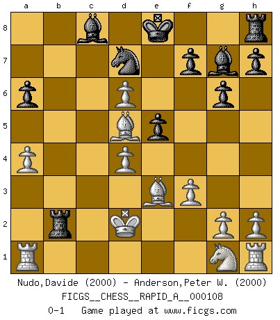 Last move : 0-1 2011 September 23 22:48:42 [Event "FICGS__CHESS__RAPID_A__000108"] [Site "FICGS"] [Date "2011.07.02"] [Round "1"] [White "Nudo,Davide"] [Black "Anderson,Peter W."] [Result "0-1"] [WhiteElo "2000"] [BlackElo "2000"] 1.e4 g6 2.d4 Bg7 3.Nc3 d6 4.Be3 a6 5.Qd2 b5 6.f3 Nd7 7.a4 b4 8.Nd1 c5 9.c3 bxc3 10.bxc3 Qa5 11.Nb2 cxd4 12.cxd4 Qxd2+ 13.Kxd2 d5 14.Bd3 e5 15.exd5 Ne7 16.d6 Nd5 17.Be4 Rb8 18.Bxd5 Rxb2+ 0-1 This chess game has been lost on time (started : 2011.07.02 9:51:48) Robatsch (Modern) defense Player Black won this chess game. Follow this game move after move (download)Chess is a cold bath for the mind. (Sir John Simon) Kleine Schachspieler machen Mist, und große Schachspieler machen Mist, aber große machen weniger Mist. (Fritz Sämisch) Nada excita más a Grandes Maestros aburridos que una novedad teórica. (Dominic Lawson) Dans le domaine de la peinture, de la gravure et de la sculpture, dès la première décennie de notre siècle, les artistes abandonnent la représentation de la partie d'échecs pour se concentrer sur les pièces, sur les échiquiers et sur toutes les variations auxquelles les unes et les autres peuvent donner lieu. On passe en quelque sorte d'un thème social à un thème musical (au sens de la musica médiévale, c'est-à-dire d'une notion qui inclue le rythme, l'harmonie, la construction et la déconstruction, etc.). Graphiquement et picturalement, l'échiquier apparaît comme une structure ouverte, dynamique, d'une richesse infinie, autorisant toutes les combinatoires et débouchant sur des mouvements et des rythmes de nature exponentielle. (Michel Pastoureau) Mac users swear by their computers. PC users swear at their computers. (Author unknown)