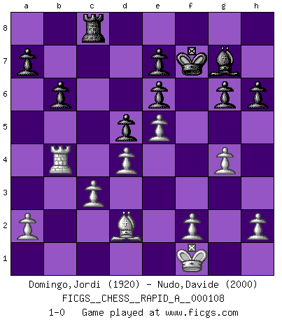Last move : 1-0 2011 October 9 23:43:36 [Event "FICGS__CHESS__RAPID_A__000108"] [Site "FICGS"] [Date "2011.07.02"] [Round "1"] [White "Domingo,Jordi"] [Black "Nudo,Davide"] [Result "1-0"] [WhiteElo "1920"] [BlackElo "2000"] 1.e4 c5 2.Nf3 d6 3.c3 Nf6 4.Be2 g6 5.O-O Bg7 6.Bb5+ Bd7 7.Bxd7+ Qxd7 8.Re1 O-O 9.d4 cxd4 10.cxd4 d5 11.e5 Ne4 12.Nc3 Nxc3 13.bxc3 Nc6 14.Ng5 Nd8 15.Qd3 Ne6 16.Qh3 h6 17.Nxe6 Qxe6 18.Qxe6 fxe6 19.Rb1 b6 20.Bd2 Rfc8 21.g4 Rc4 22.Rb4 Rac8 23.Reb1 Rxb4 24.Rxb4 Kf7 25.Kf1 1-0 This chess game has been lost on time (started : 2011.07.02 9:51:48) Sicilian Kingside Castling by player White (move 5) Kingside Castling by player Black (move 8) Player White won this chess game. Follow this game move after move (download)Chess is a more highly symbolic game, but the aggressions are therefore even more frankly represented in the play. It probably began as a war game; that is, the representation of a miniature battle between the forces of two kingdoms. (Karl Meninger) Ja, jede Frau in Holland liebt mich bestimmt, und alle Männer hassen mich. (Loek van Wely) Debió haber existido una vez en que los hombres eran semidióses, de otra manera no hubiesen podido inventar el Ajedrez. (Gustav Schenk) Je fais ceci parce que dans cinquante coups j'obtiendrai cela; je m'appelle Mikhail Moisevitch Botvinnik. (Botvinnik) The meaning of life is that it is to be lived, and it is not to be traded and conceptualized and squeezed into a pattern of systems. (Bruce Lee)